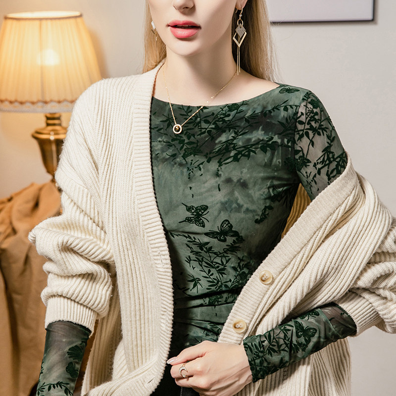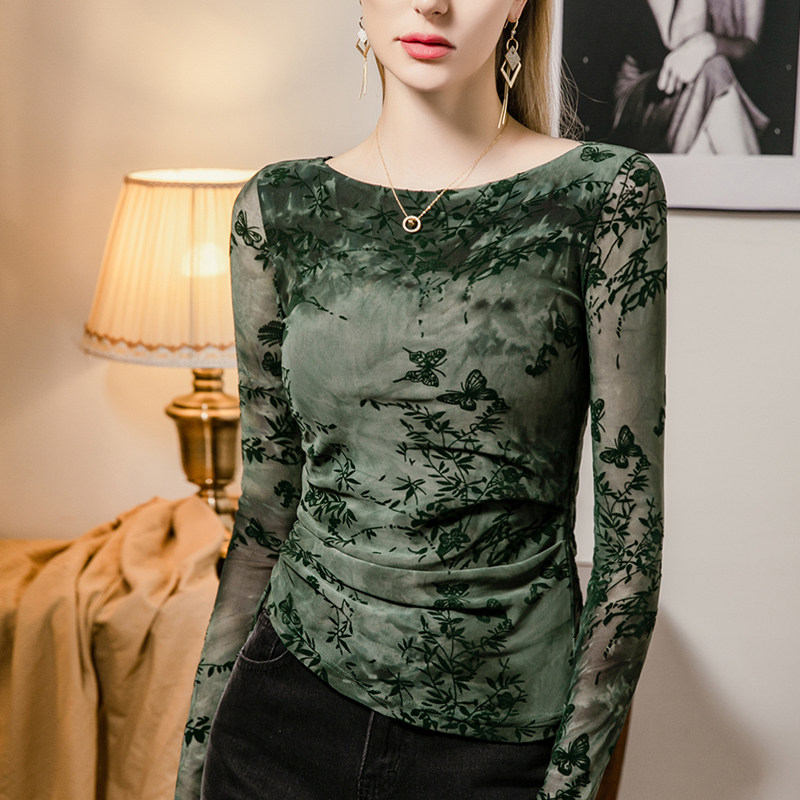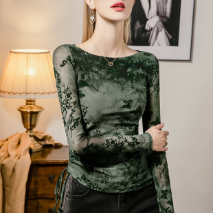 打底衫 植绒印花网纱上衣女修身 一字领褶皱拼接女装 新款 2026春季