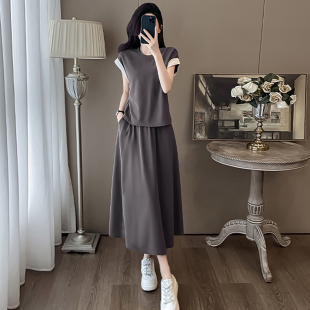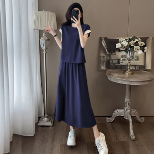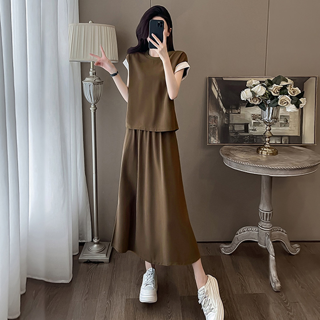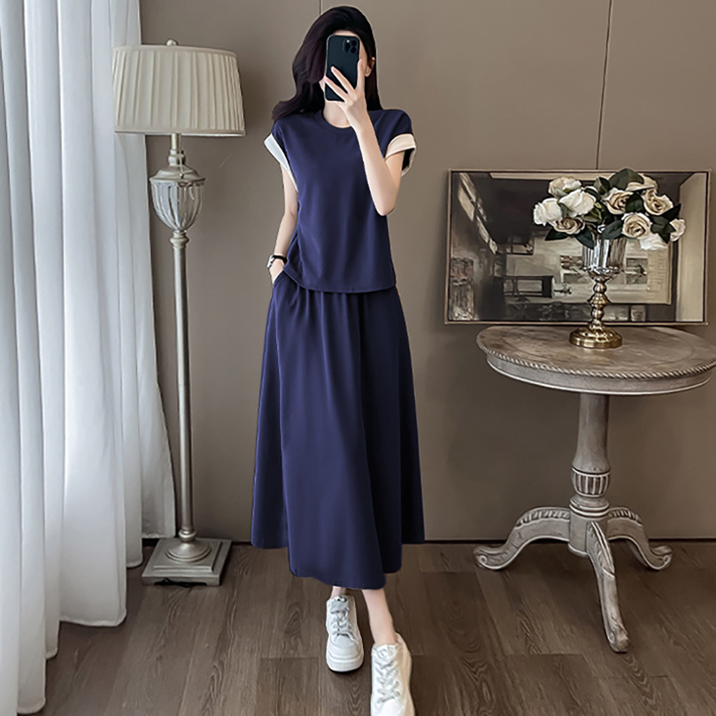 宽松百搭气质显瘦撞色女裙套装 清仓捡漏两件套拼色短袖 长裙夏季