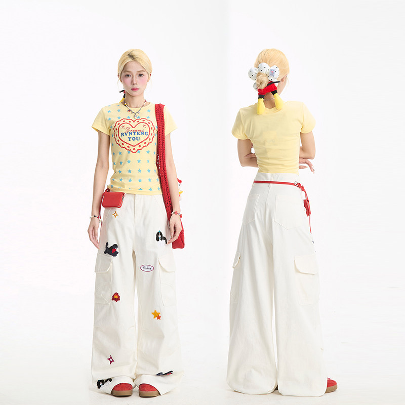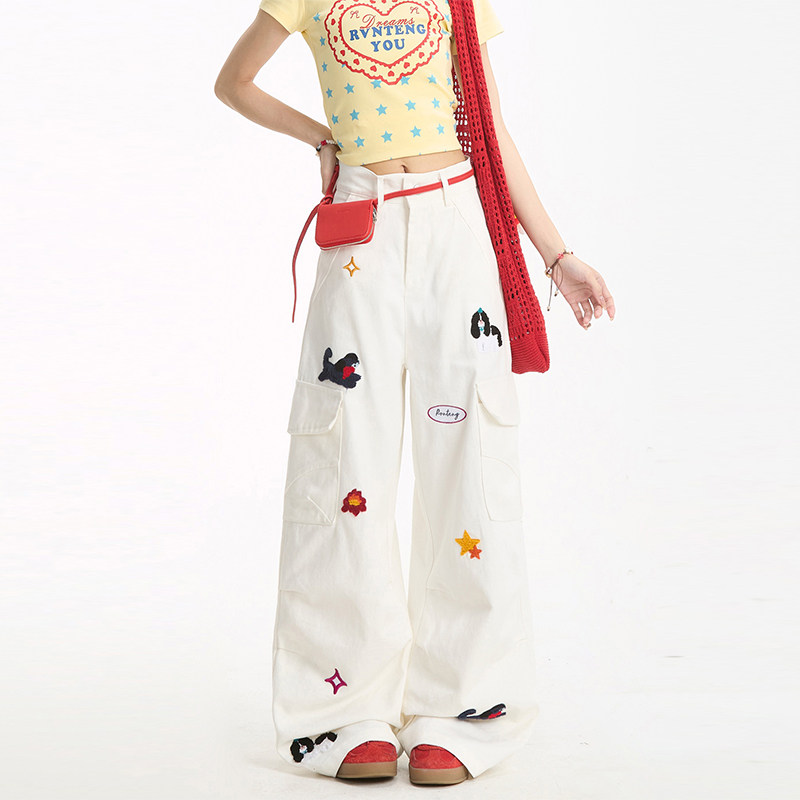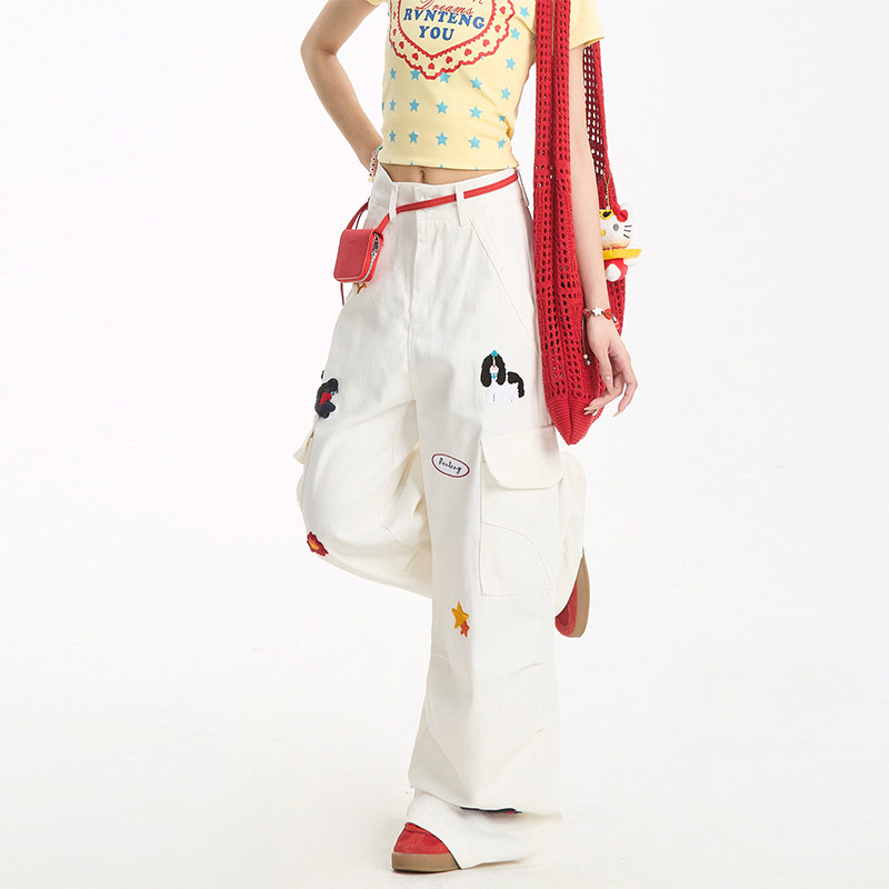宽松显瘦百搭裤 NERESUM趣味刺绣工装 多口袋褶皱直筒裤 女美式 子 裤