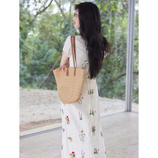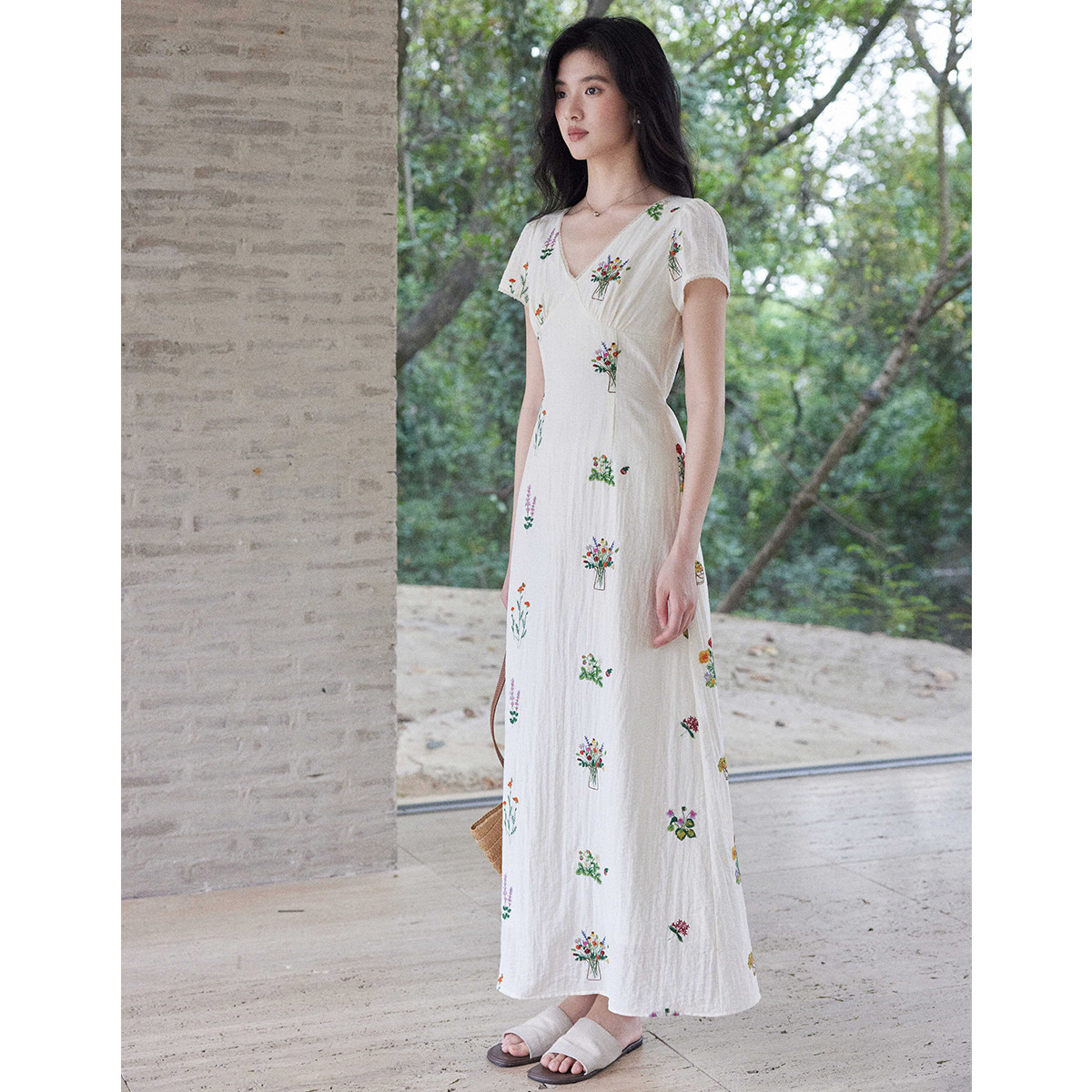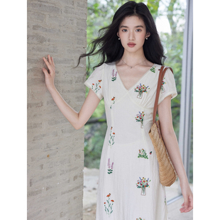 连衣裙女v领短袖 亚麻花朵刺绣文艺修身 气质长裙 花信 贰羊设计