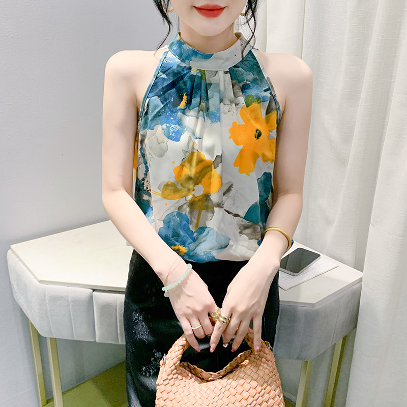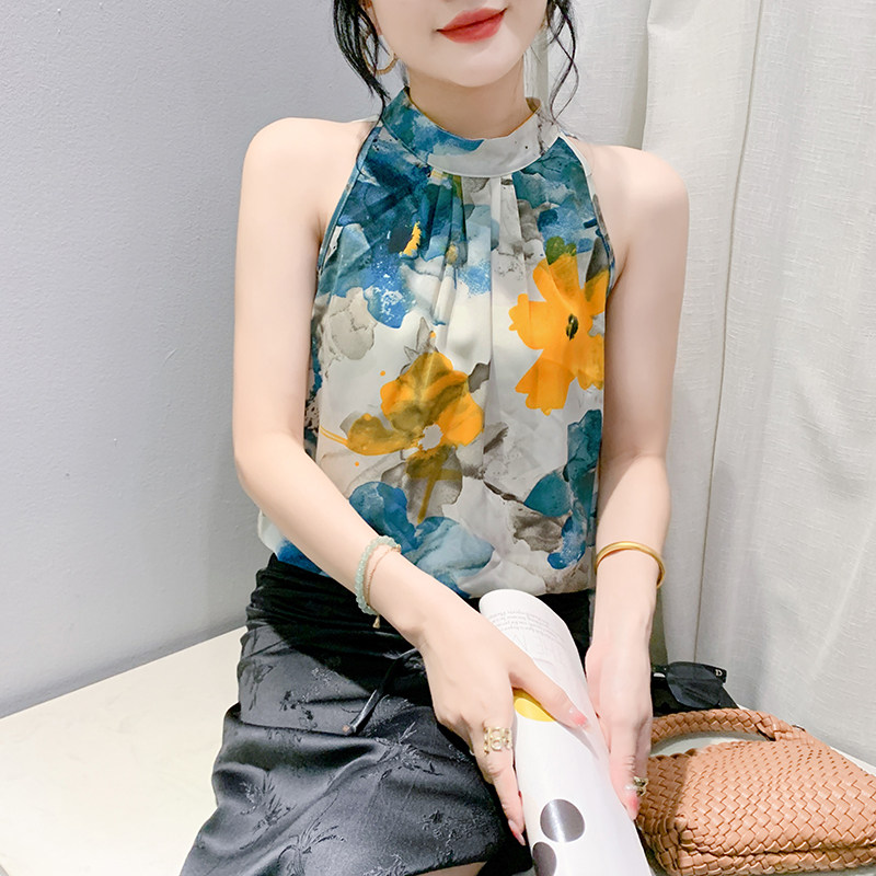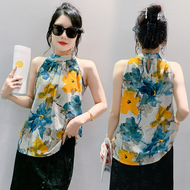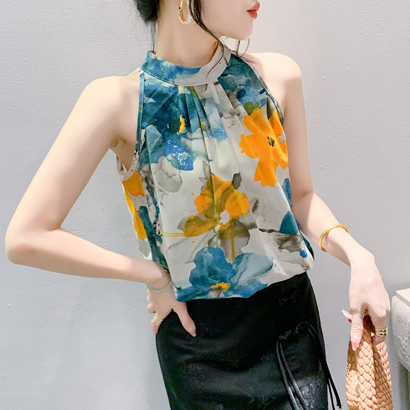 外穿漂亮小衫 法式 衬衫 性感无袖 潮 碎花挂脖吊带雪纺上衣女背心夏季
