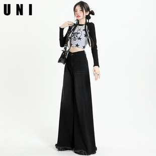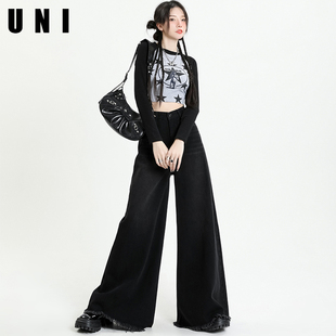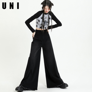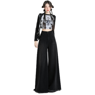 脚宽松毛边拖地裤 春秋复古高腰大裤 女2023年新款 黑灰色阔腿牛仔裤