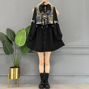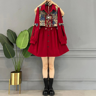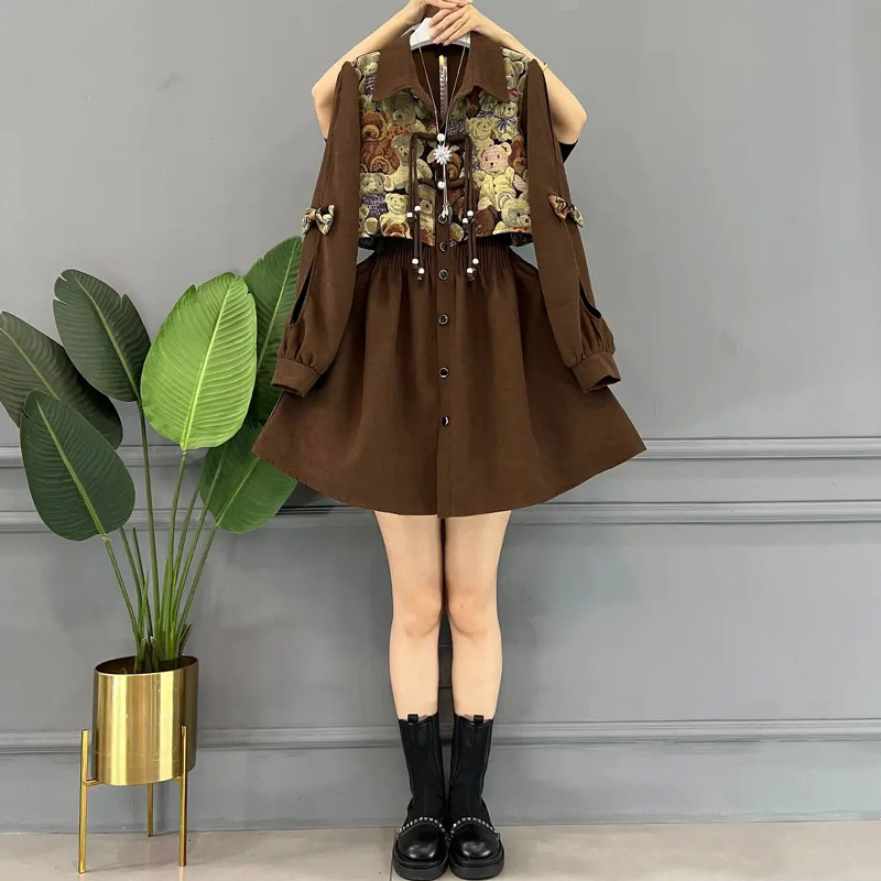 大码 翻领拼接流苏盘扣卡通小熊收腰连衣裙胖MM学院风减龄裙子 女装