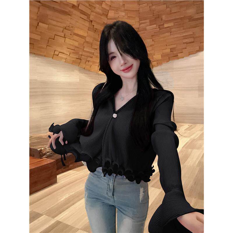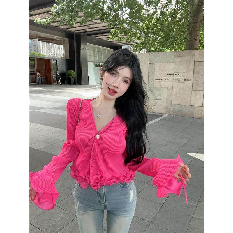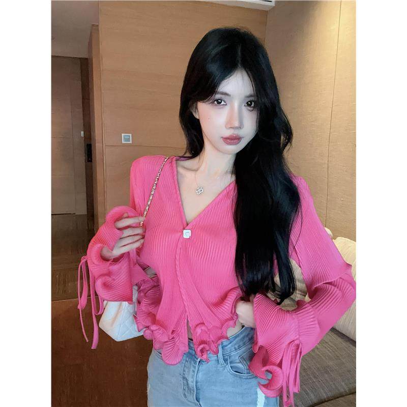 上衣高级感开衫 喇叭袖 独特v领短款 女早秋法式 外套 荷叶边雪纺衬衫