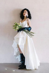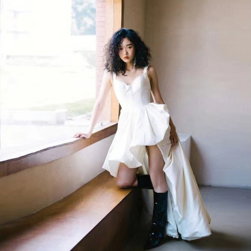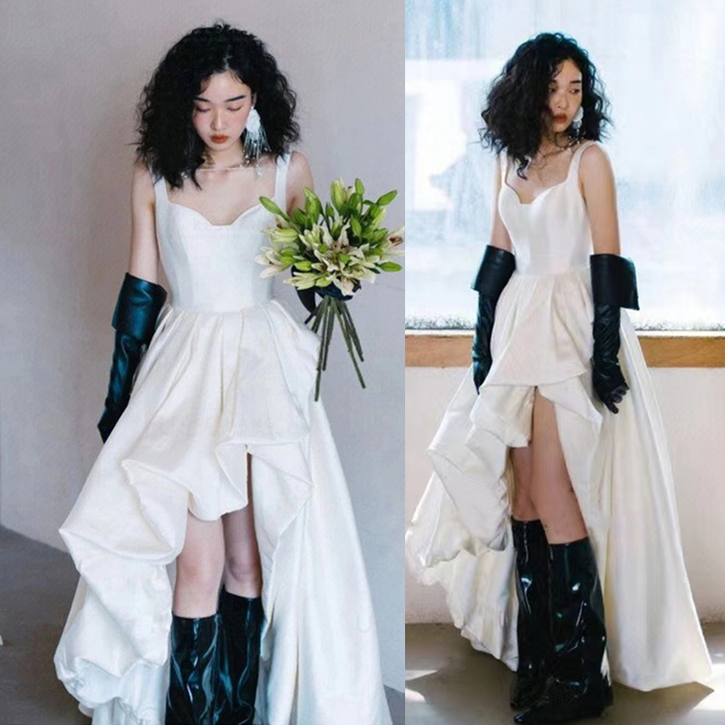 一字肩白色蕾丝轻婚纱法式 高级感订婚新娘森系超仙出门纱礼服 长袖