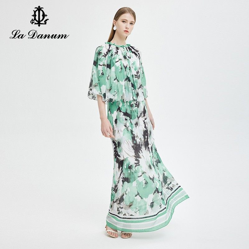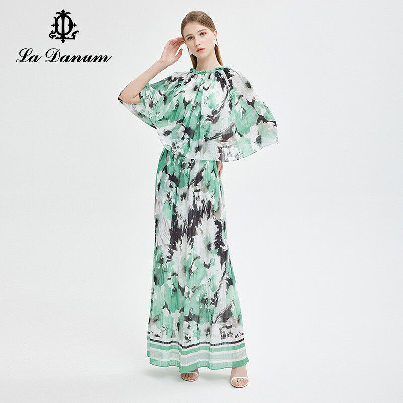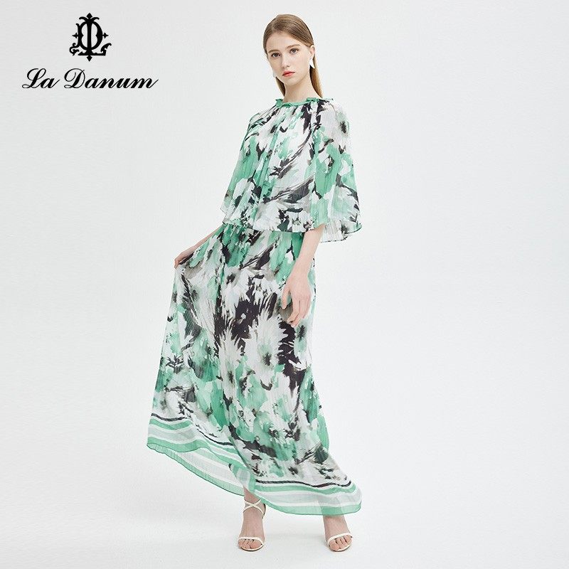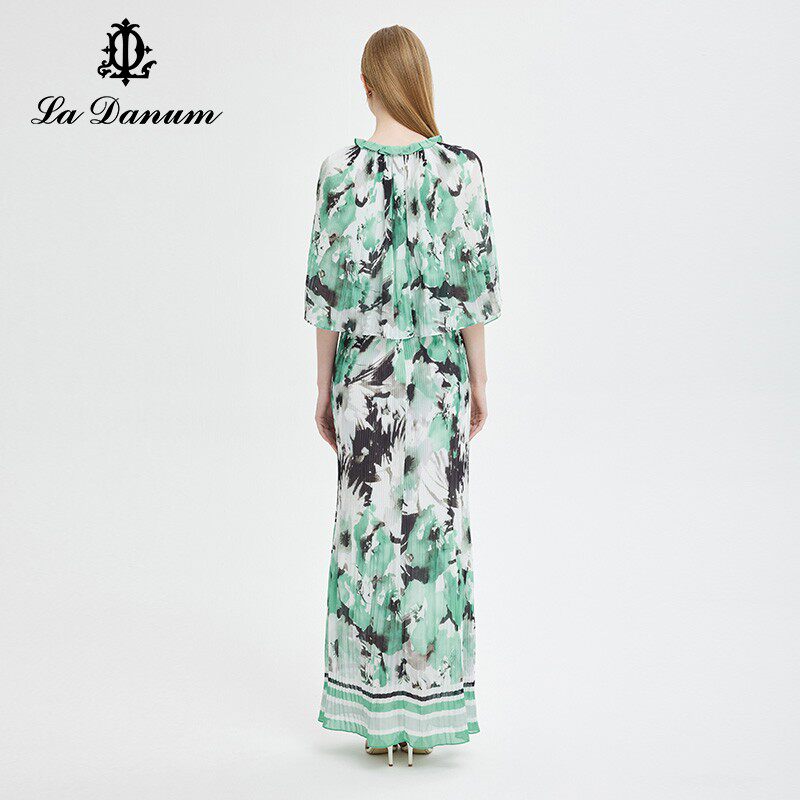 阿丹娜女装 水墨风印花连衣裙子披肩修百褶裙荷叶边度假LCS608DR0
