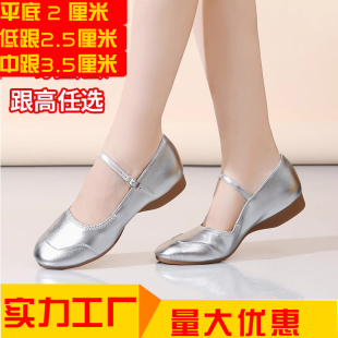 女成人软底儿童中老年演出跳舞鞋 真皮中跟银色舞蹈鞋 广场舞鞋 四季