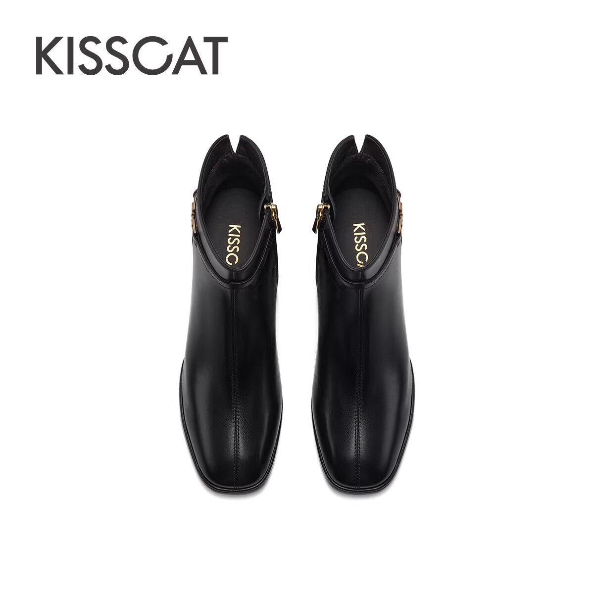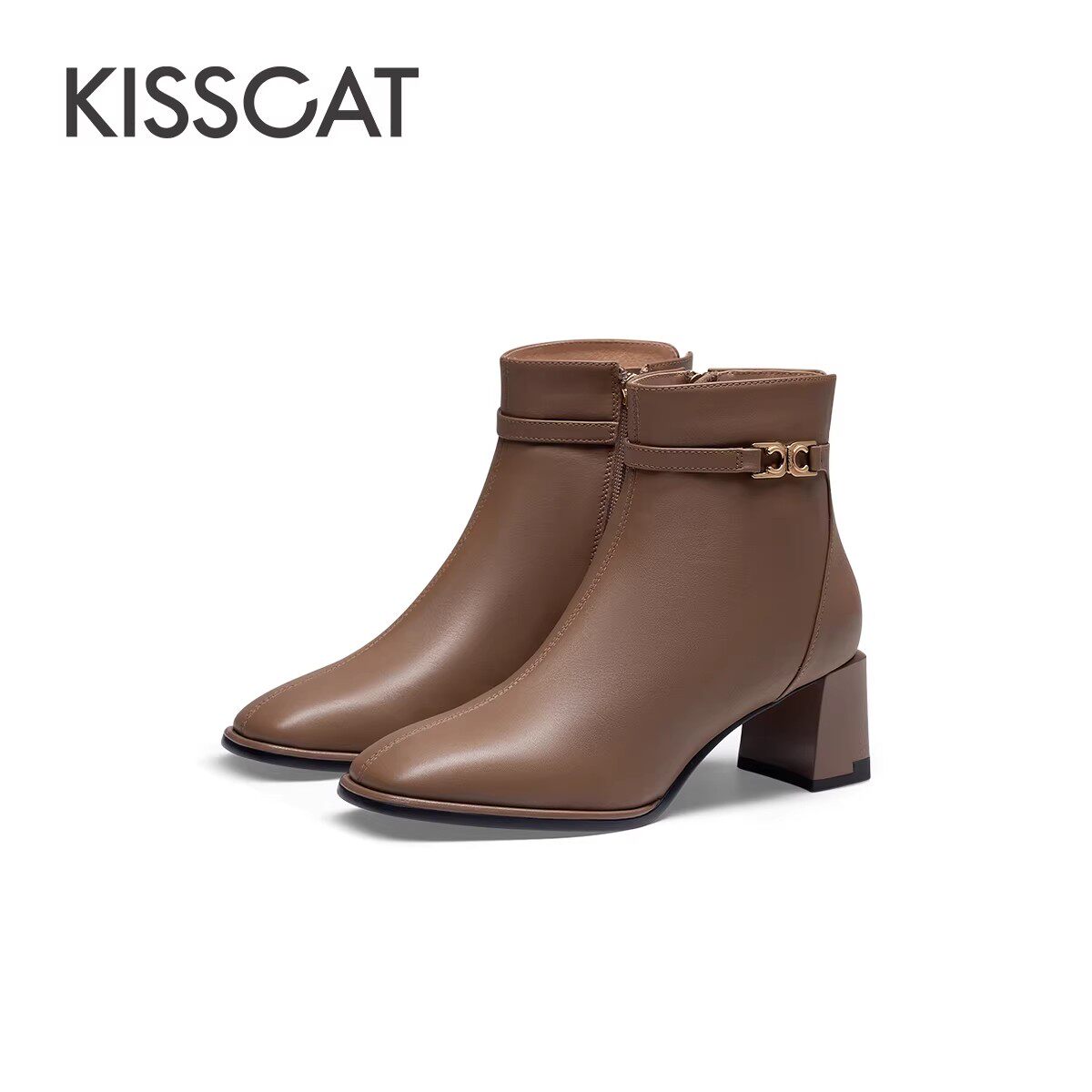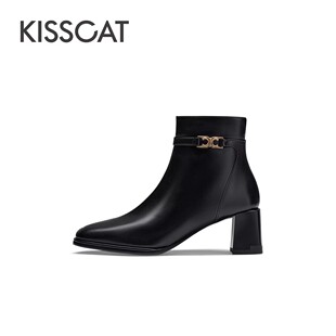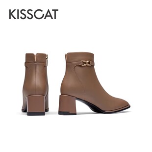 KISSCAT接吻猫秋冬季 靴女士加绒真皮方头通勤短靴女 粗跟饰扣时装