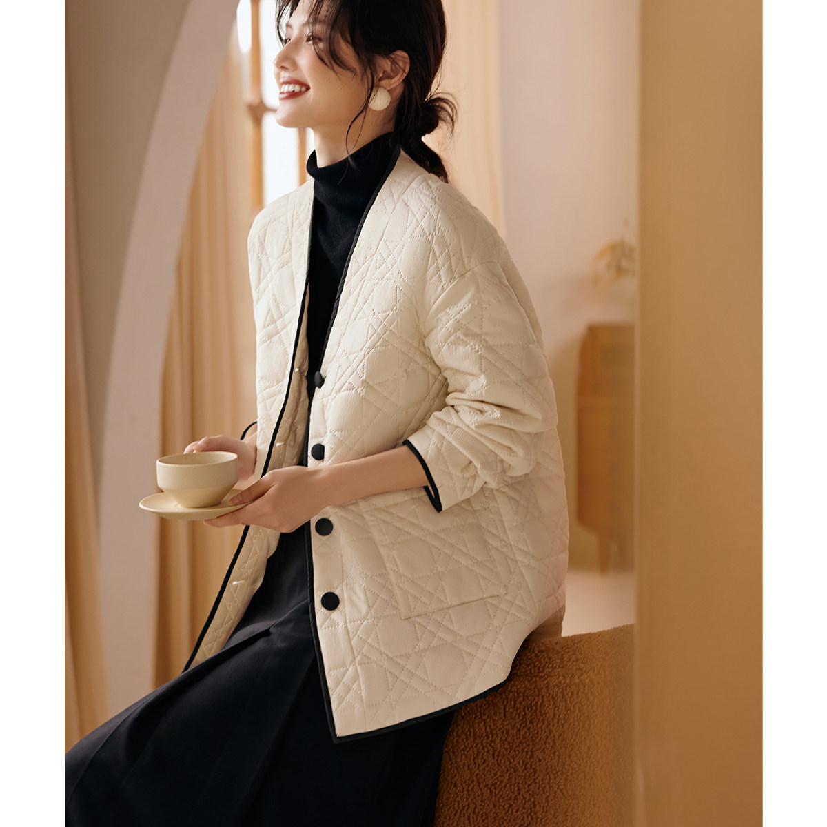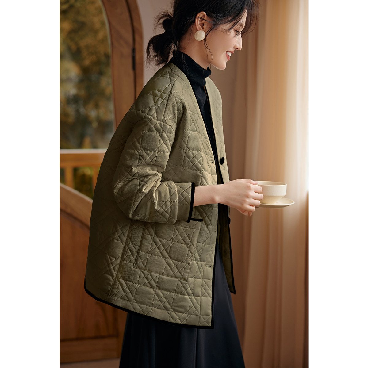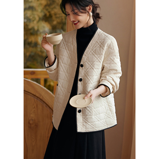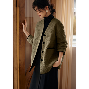 复古菱形格夹棉外套200斤 女装 胖mm冬季 巴恩翻领棉服木子理想大码