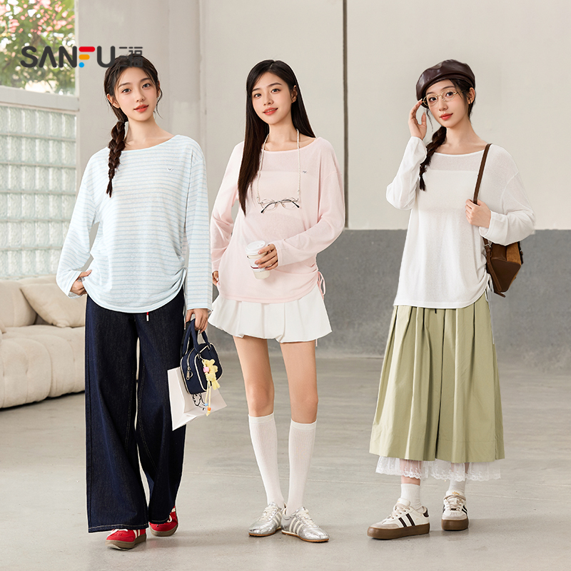 韩系慵懒松弛感上衣女装 三福长袖 宽松罩衫 秋季 504829 T恤2025新款