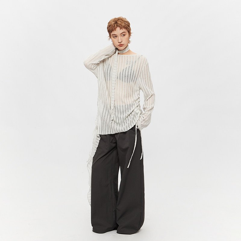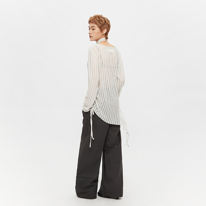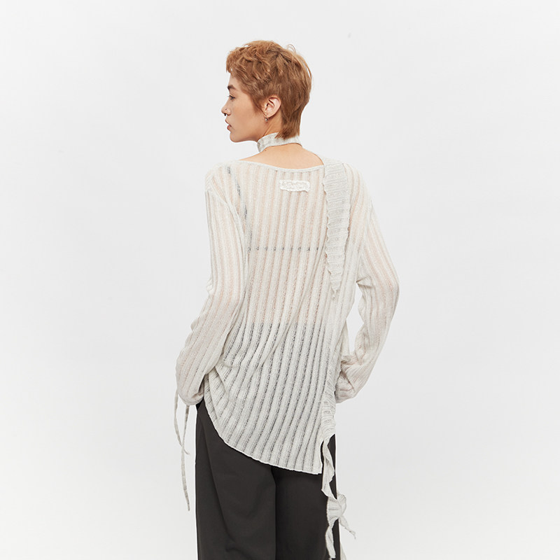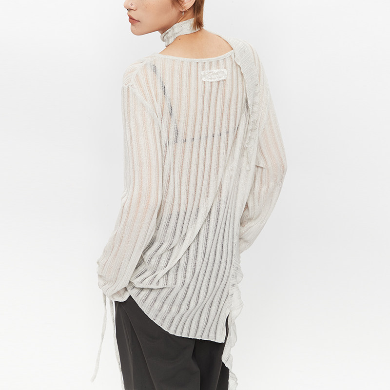 T恤女微透辣妹罩衫 长袖 上衣夏 性感纯欲不规则条纹薄款 AIRHOOD秋季