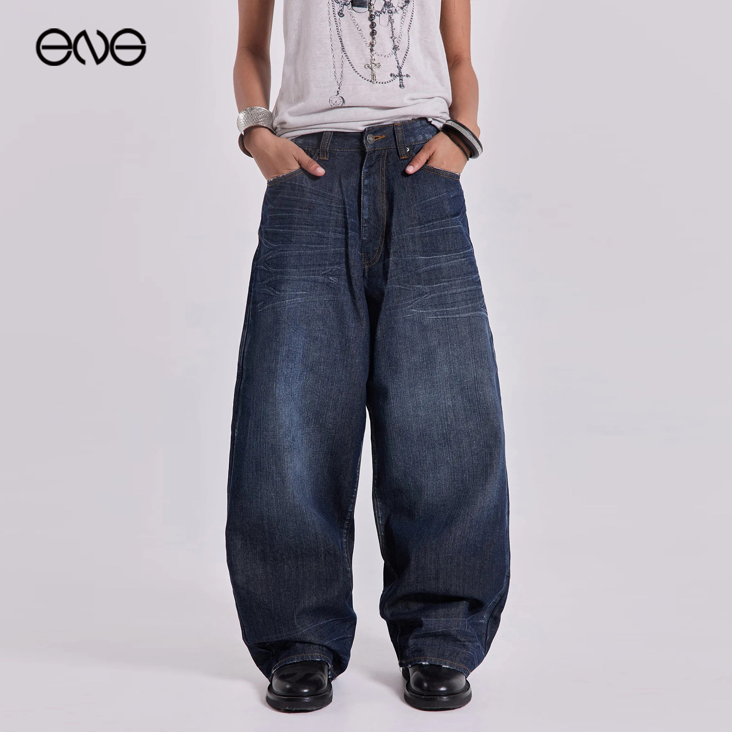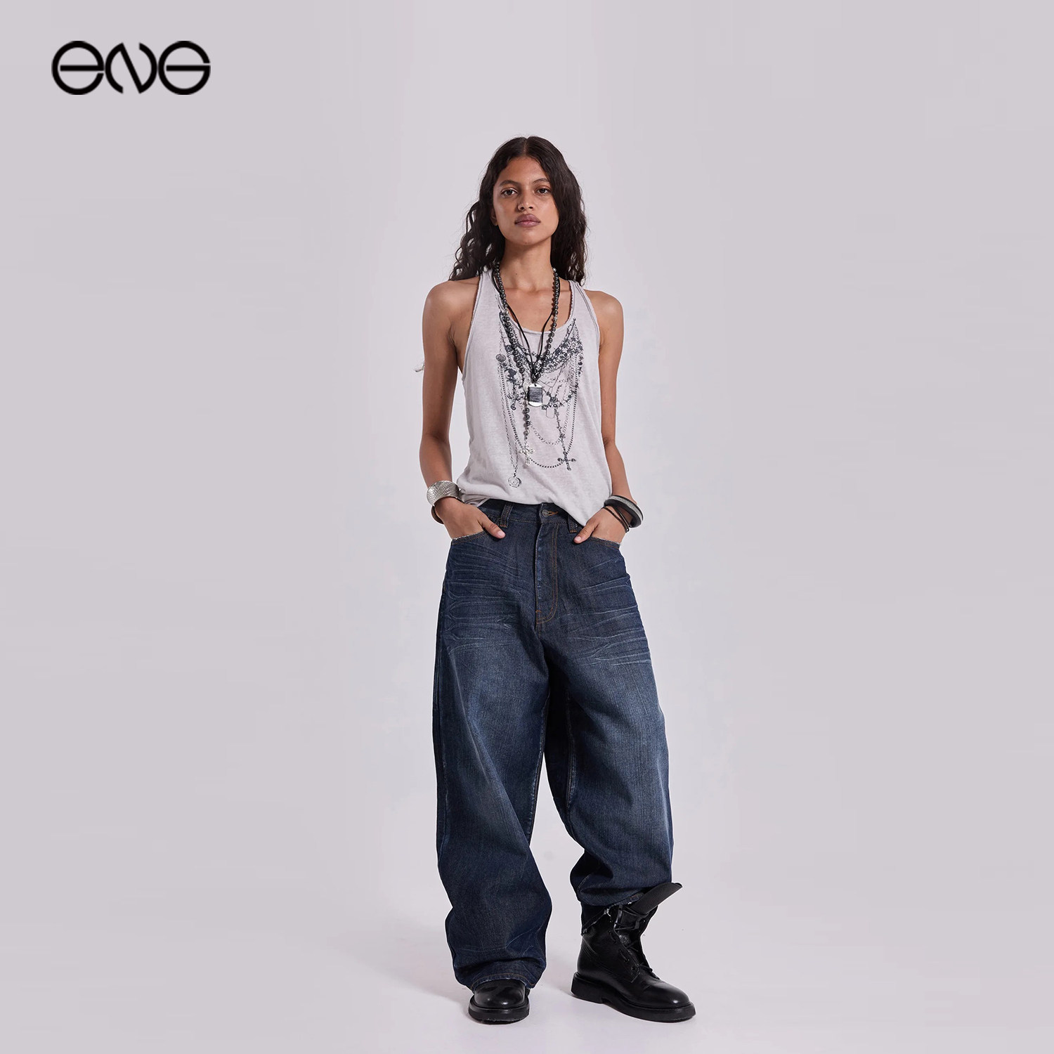 女小个子宽松显瘦直筒阔腿拖地裤 美式 复古水洗蓝色做旧弯刀牛仔裤