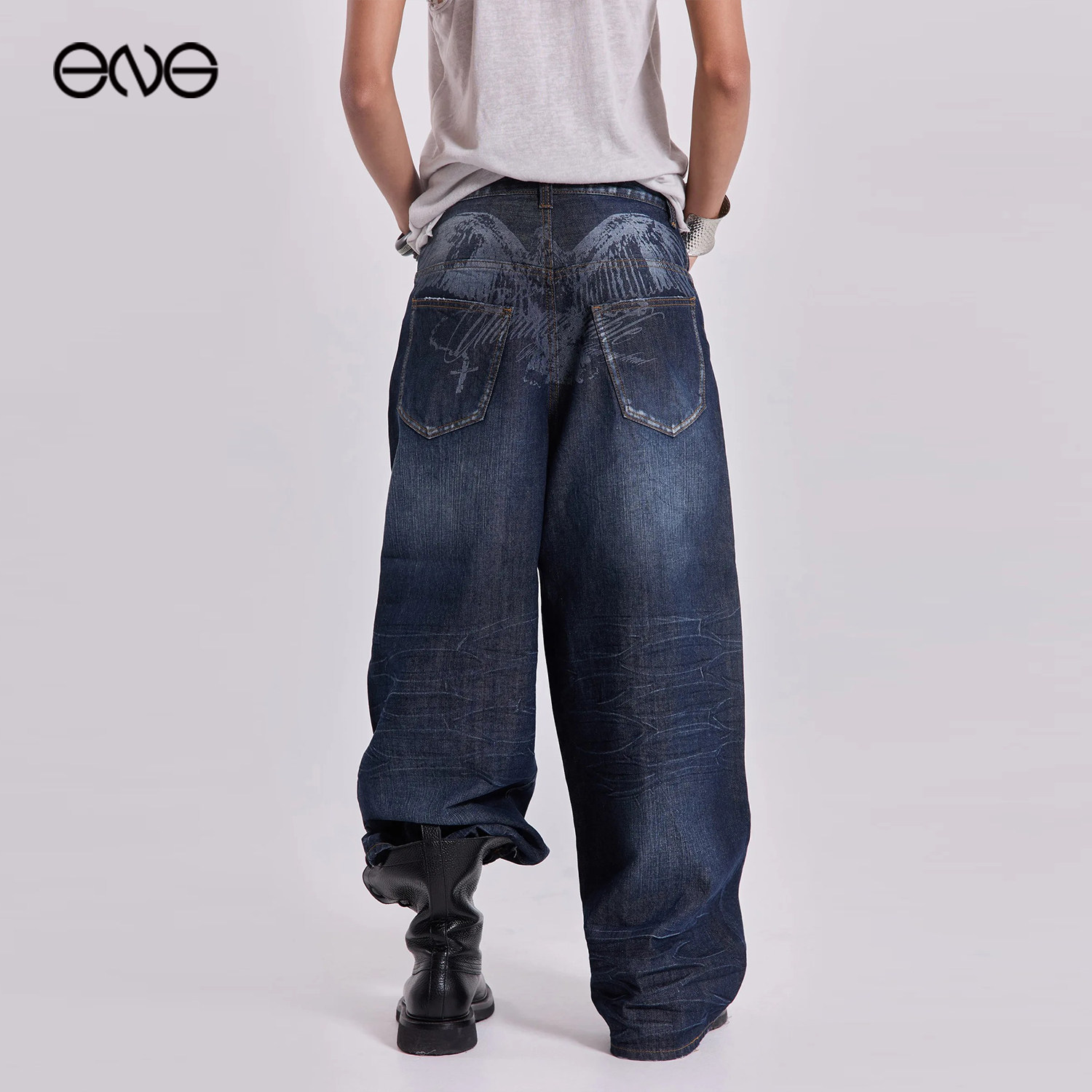 潮牌百搭高街松紧抽绳休闲长裤 男秋季 复古水洗直筒牛仔裤 男道美式