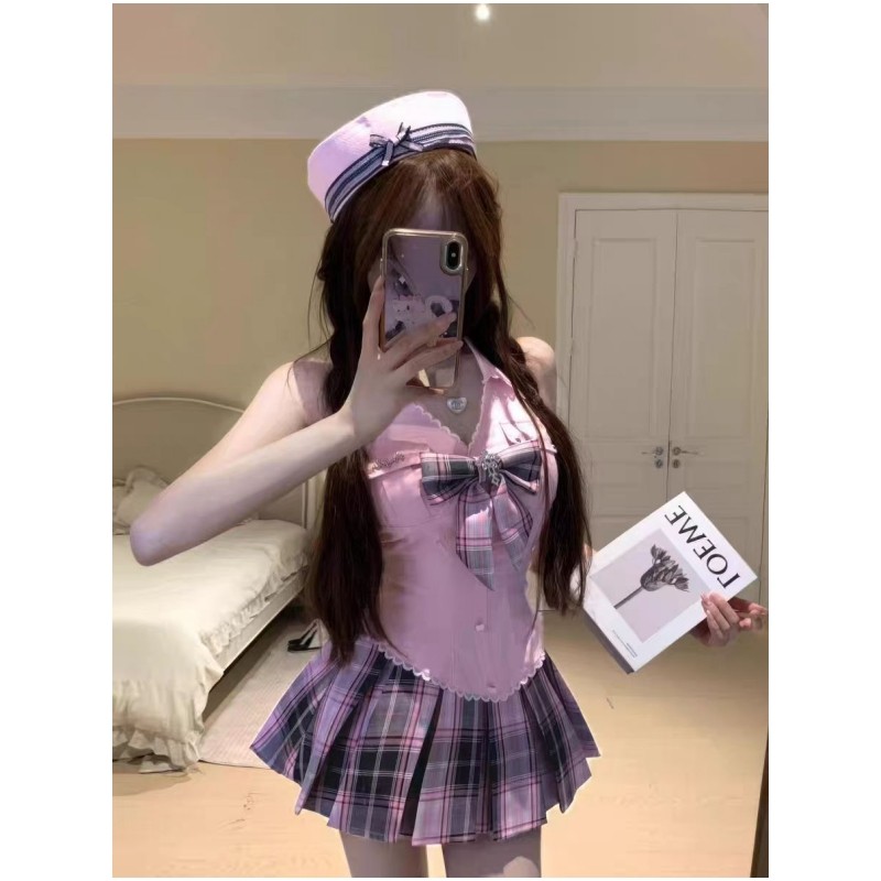 纯欲少女感辣妹学院风制服粉色挂脖无袖 蝴蝶结上衣格纹百褶裙套装