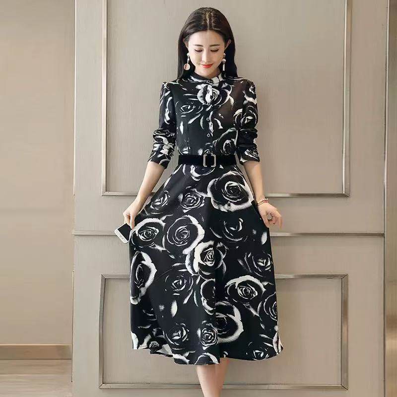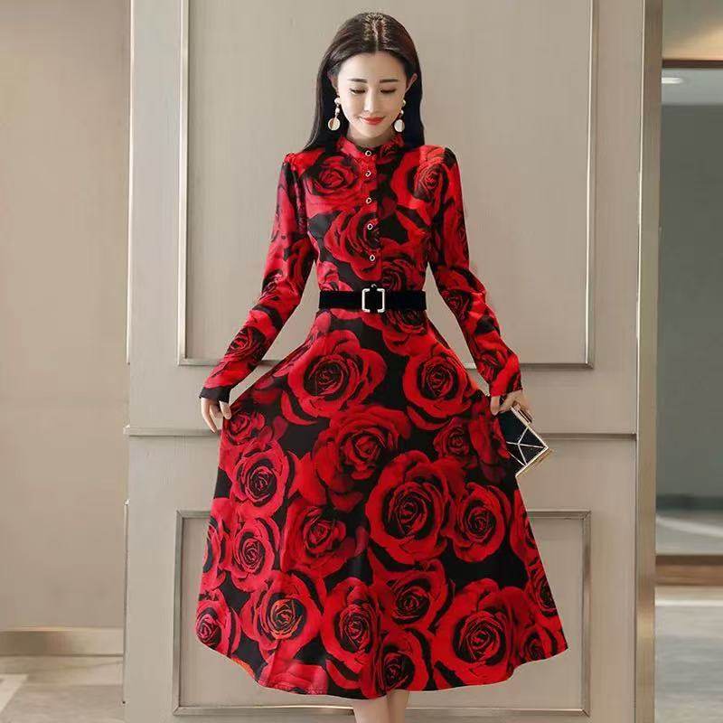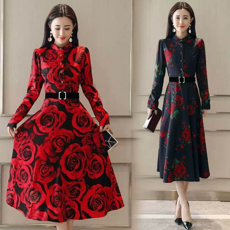欧美风印花圆领长袖 女装 连衣裙圣诞节晚礼服高腰A字裙子 新款 秋季