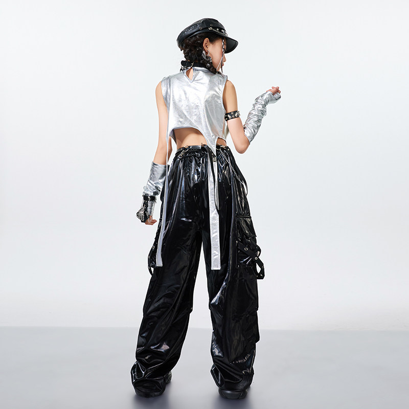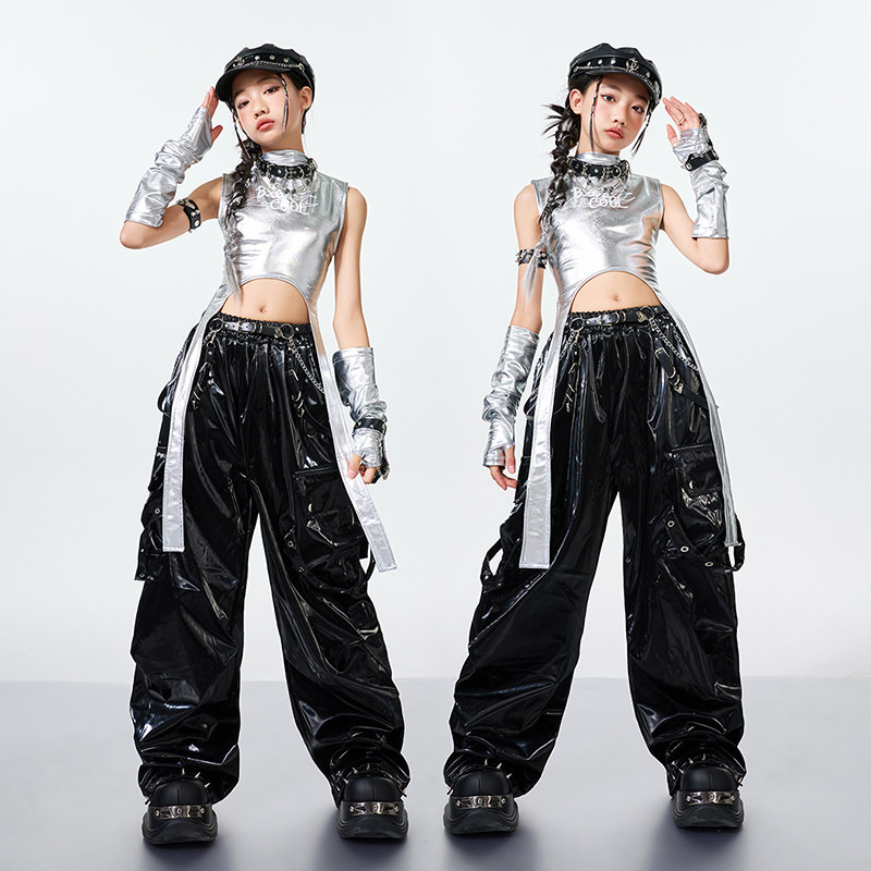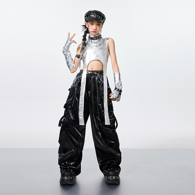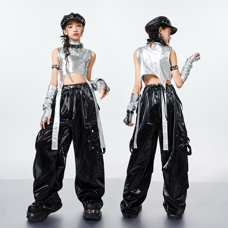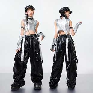 儿童爵士舞服装 街舞演出服潮酷模特走秀 女童露脐JAZZ银色皮衣套装