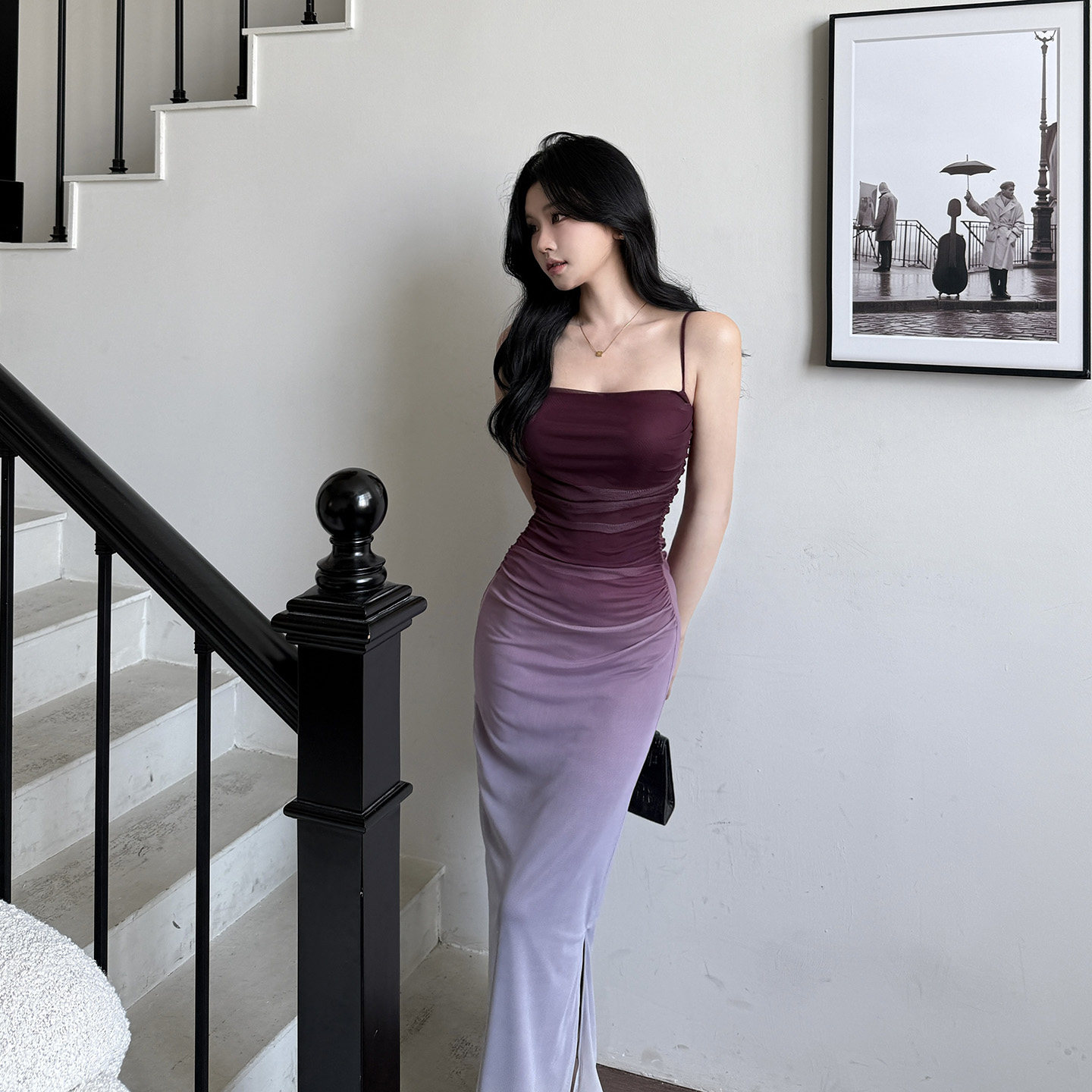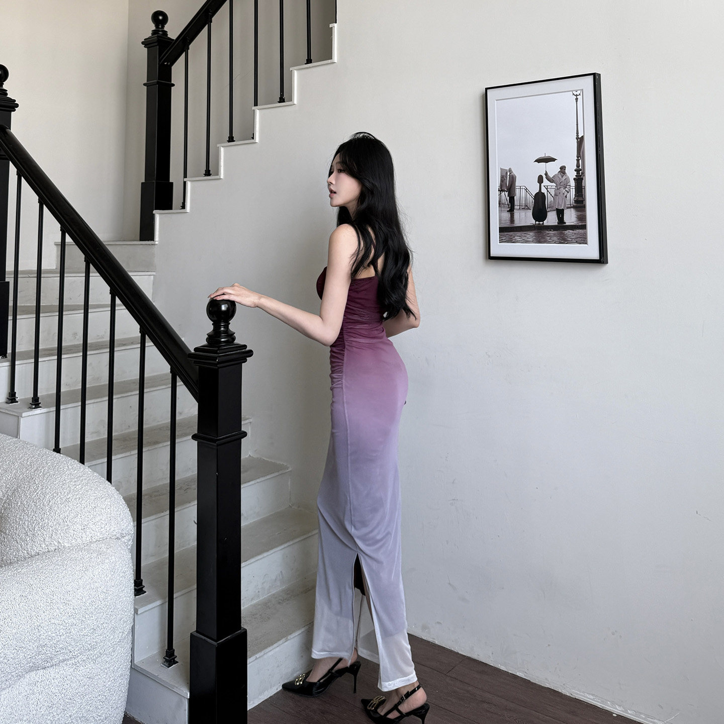 GirlsAt18 包臀裙礼服长裙 紫色渐变网纱吊带连衣裙女高级性感修身