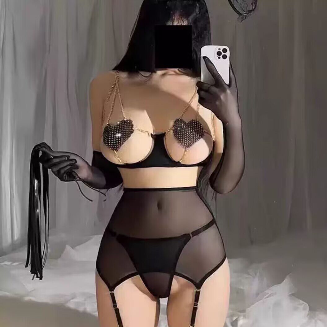 纯欲性感爱心钢托聚拢文胸套装 仿钻石闪耀小胸显大链条透视睡衣
