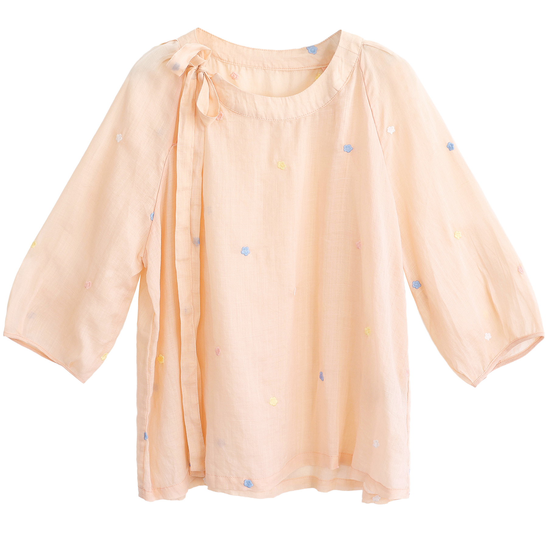 飘逸减龄七分袖 多巴胺 飘带上衣 重工刺绣小花纯苎麻小衫 绿素棉