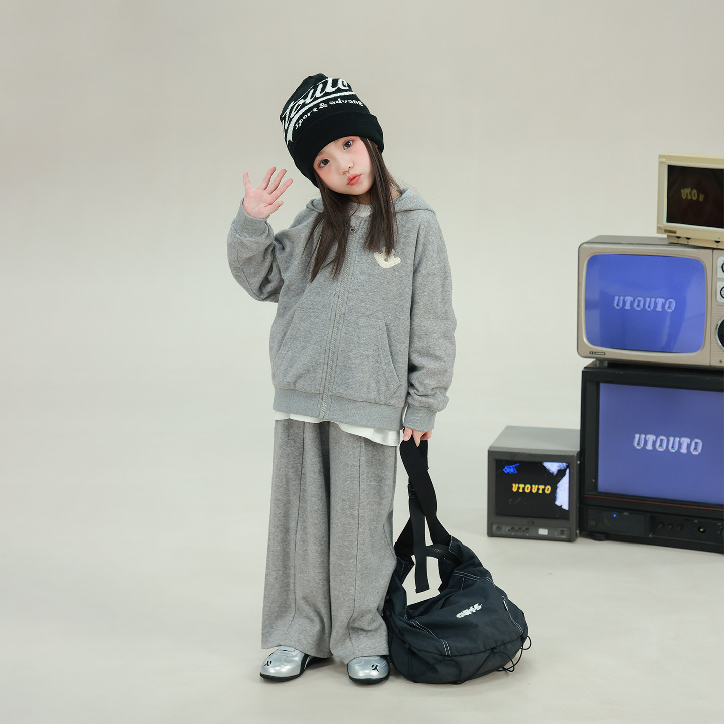 三件套装 韩式 灰色阔腿长裤 翻领毛衣开衫 温柔慵懒风立领马甲棉服