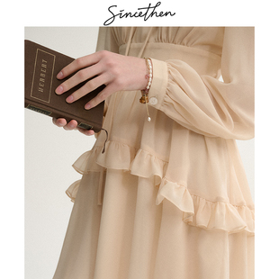 云分子原创春秋森女日系高领白色连衣裙女秋灯芯绒长袖 荷叶边短