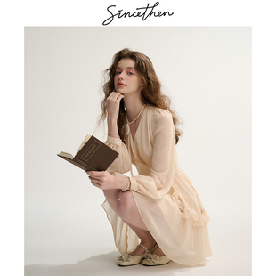 云分子原创春秋冬季 蕾丝显瘦超重工螺旋下摆气质连衣裙 V领长袖