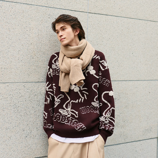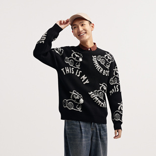 撞色情侣毛衣宽松套头衫 森马史努比系列毛衫 提花针织衫 满版 男冬季