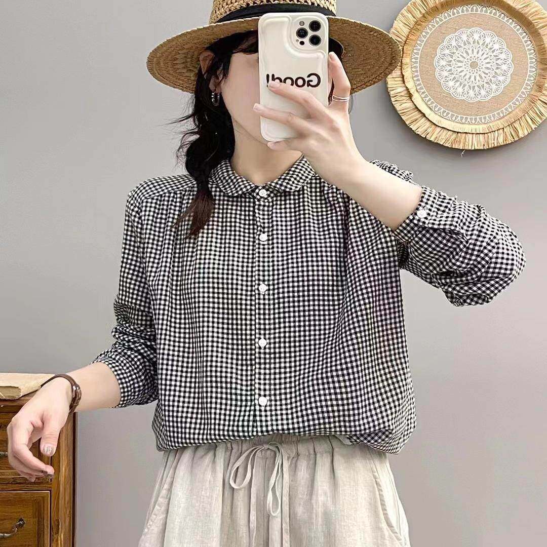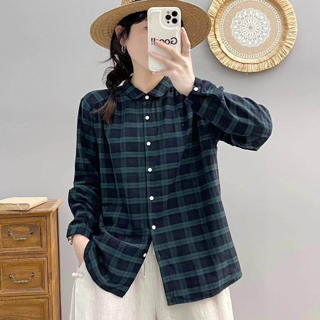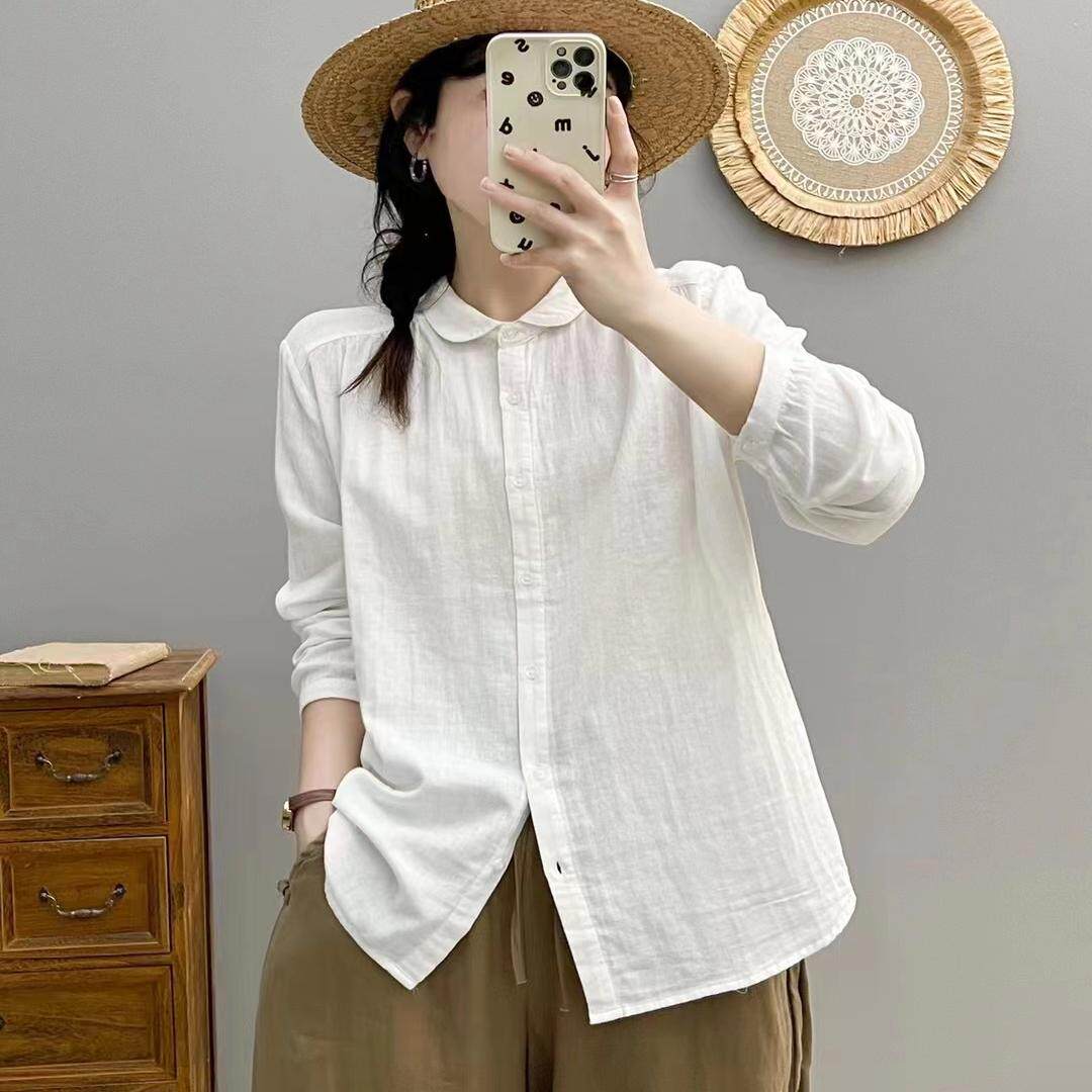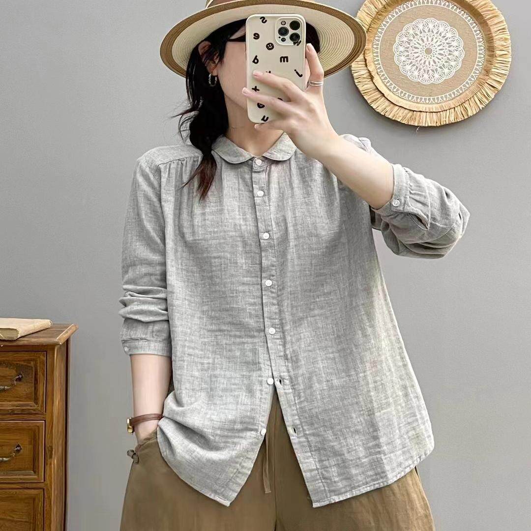 春秋百搭圆领减龄通勤打底衬衣纯棉111 女 文艺双层棉纱长袖 衬衫
