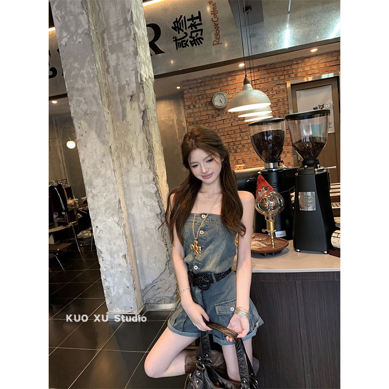 夏日套装 连体裤 牛仔连衣裤 辣妹抹胸背心阔腿短裤 美式 ootd巨好看