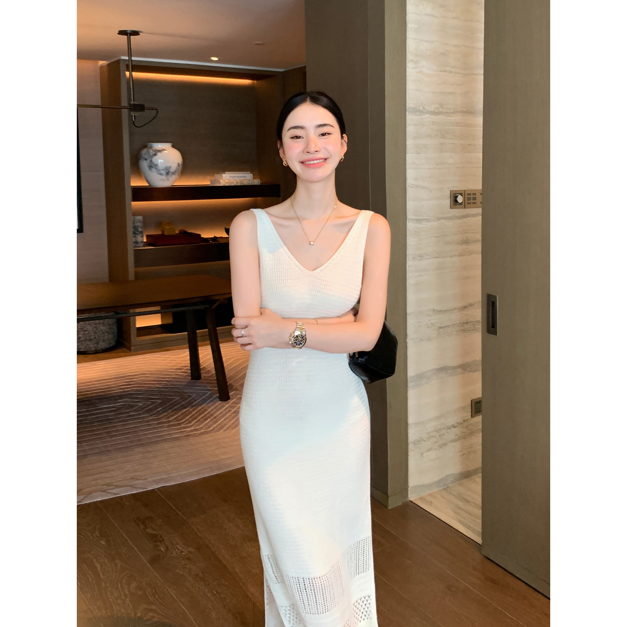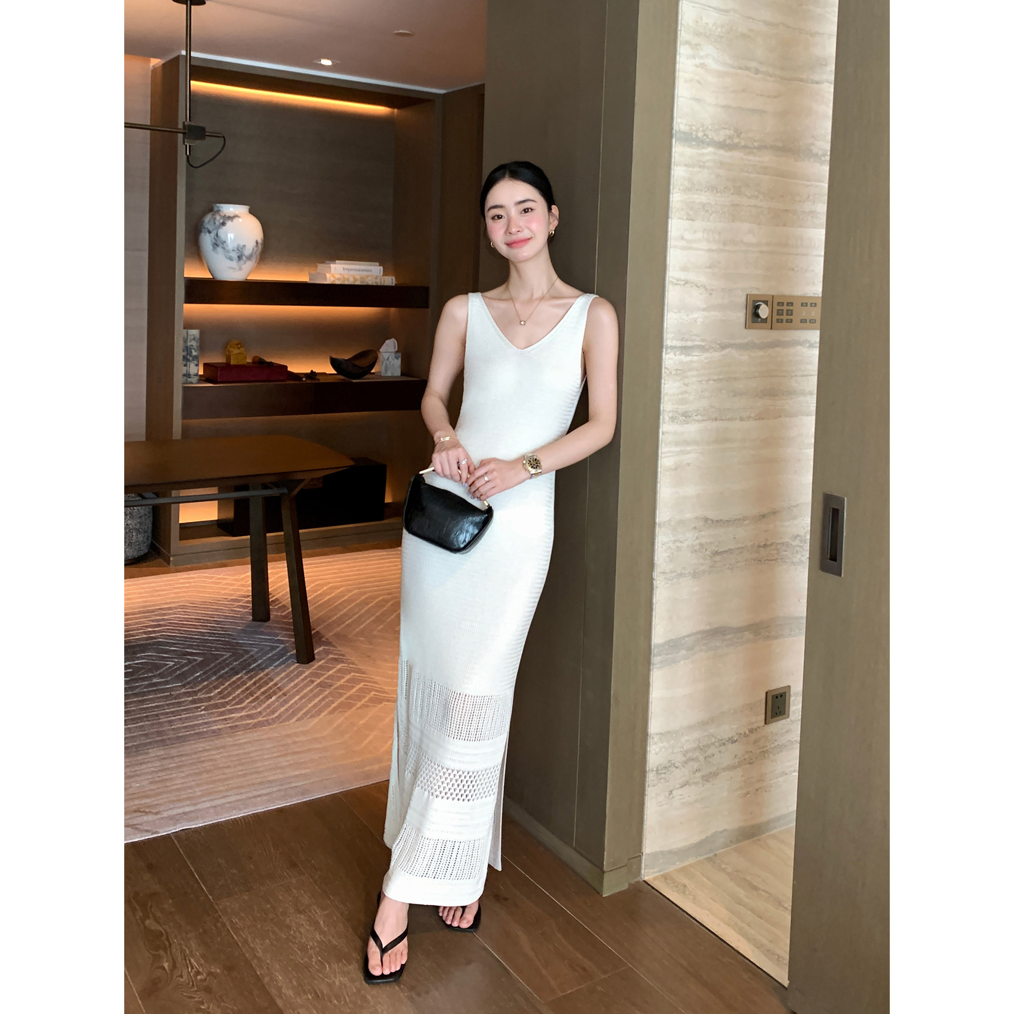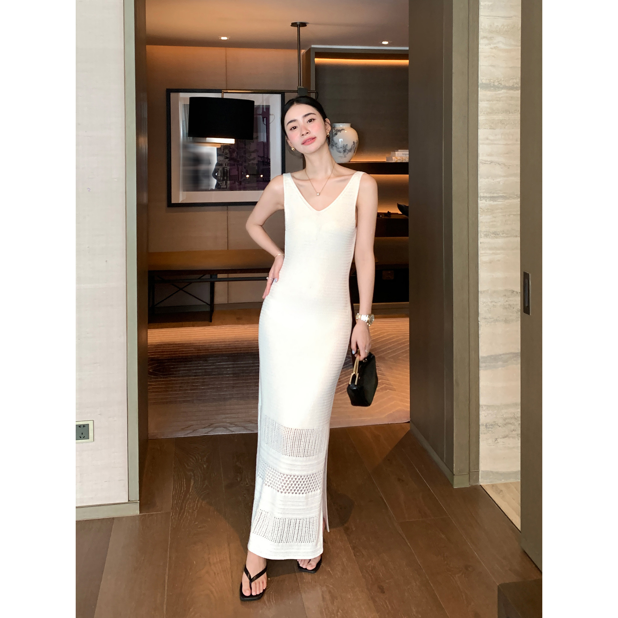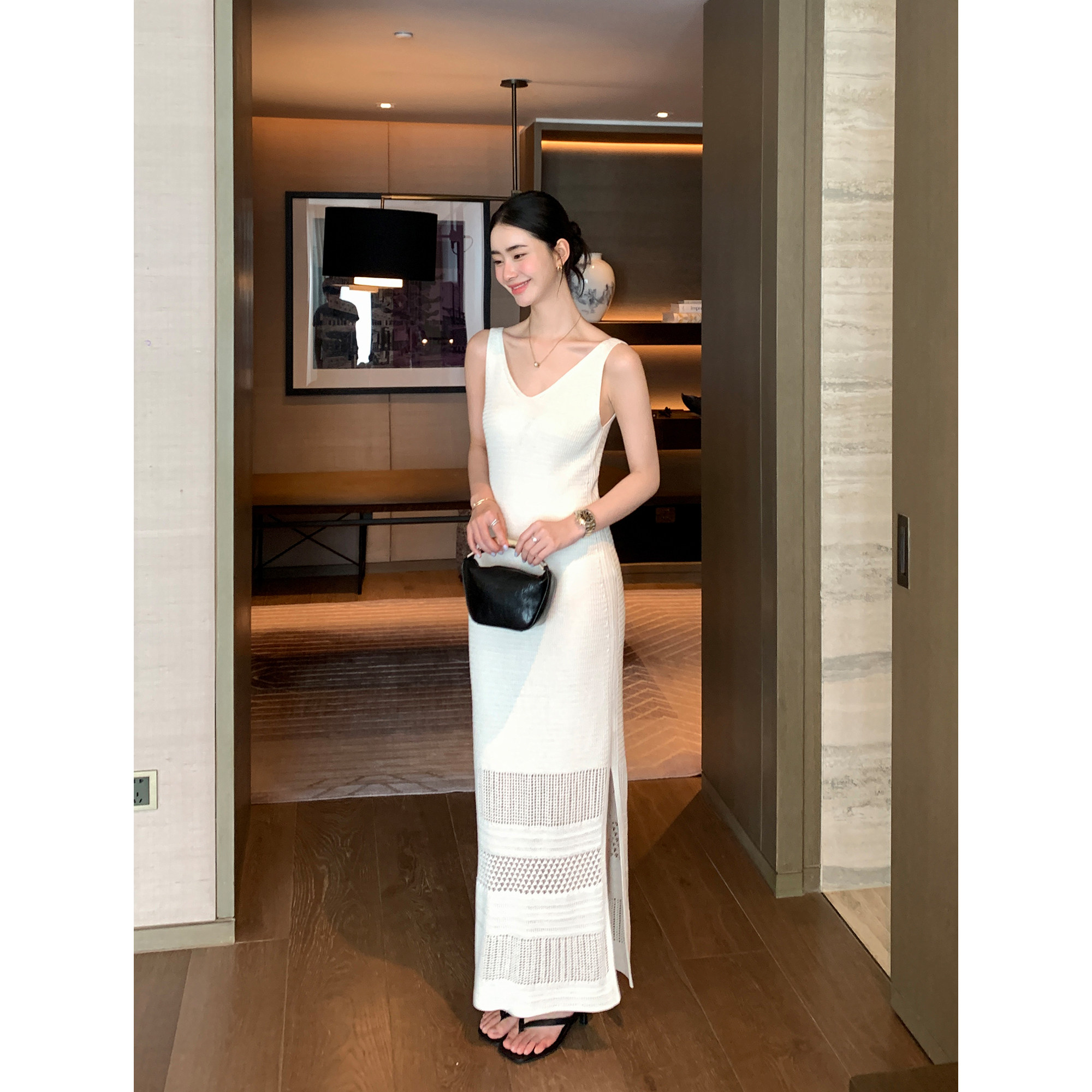 镂空钩花吊带连衣裙女V领收腰背心裙 重磅莱赛尔亚麻 Maven Lin