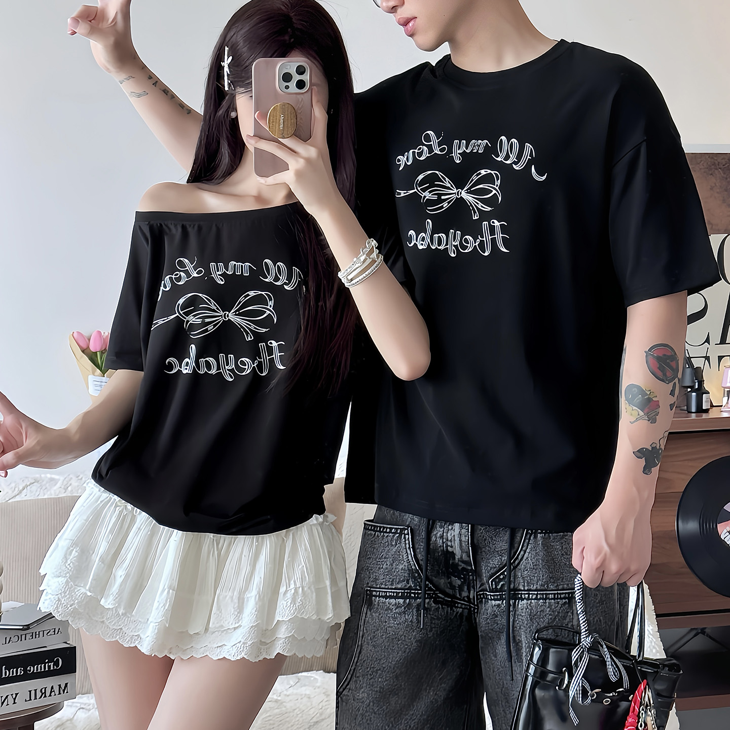 斜肩短袖 情侣装 2025新款 套装 t恤小众设计感一长一短高级感潮 夏装