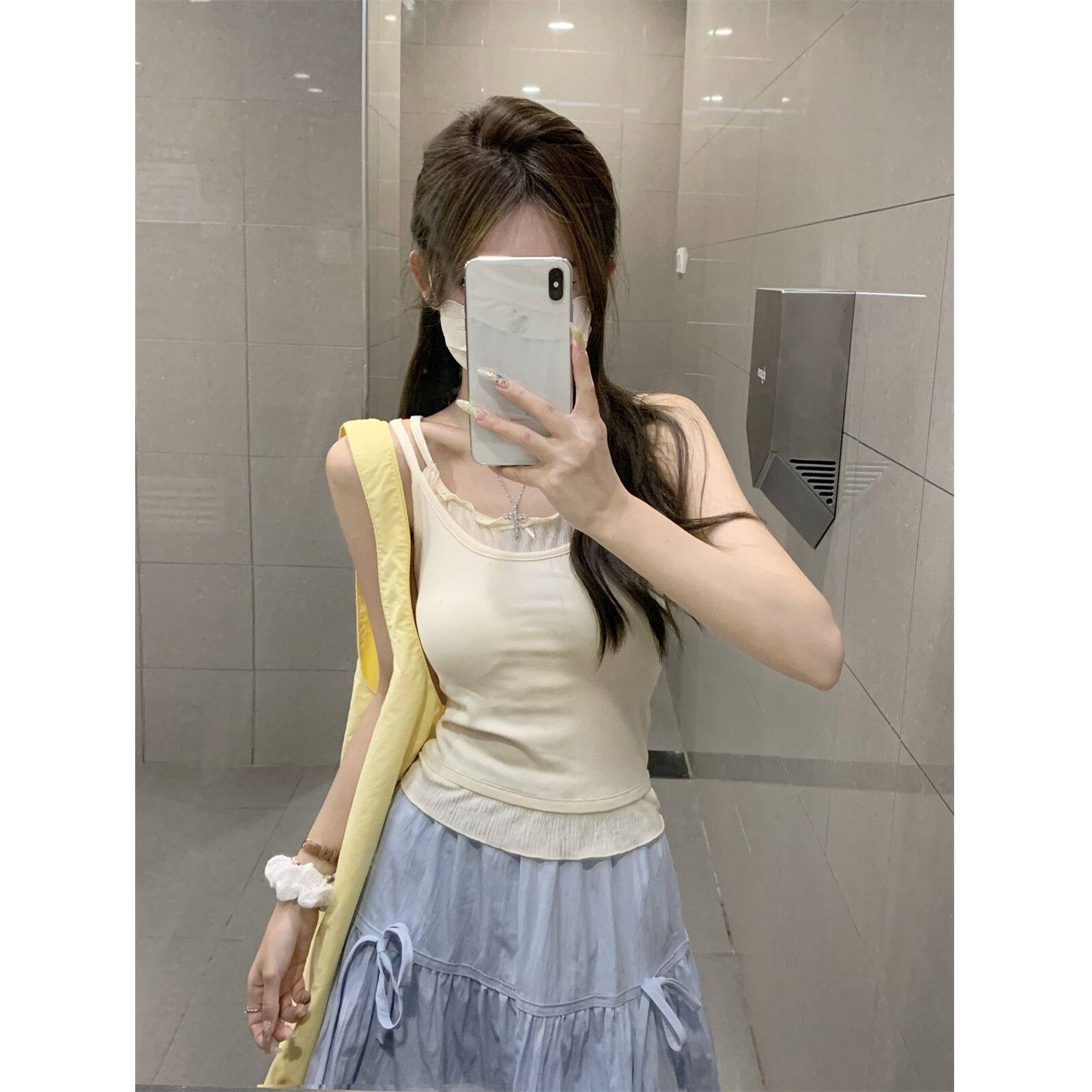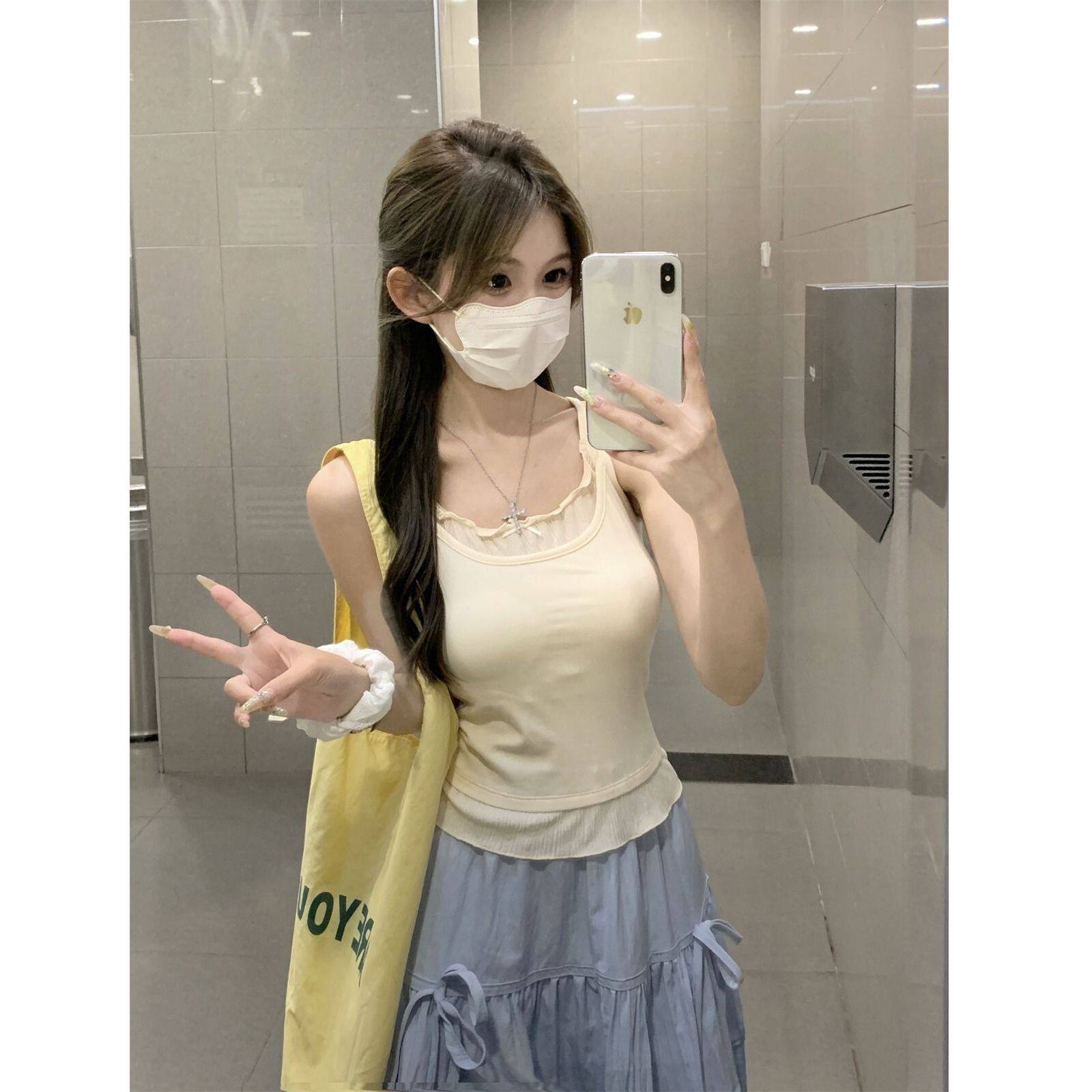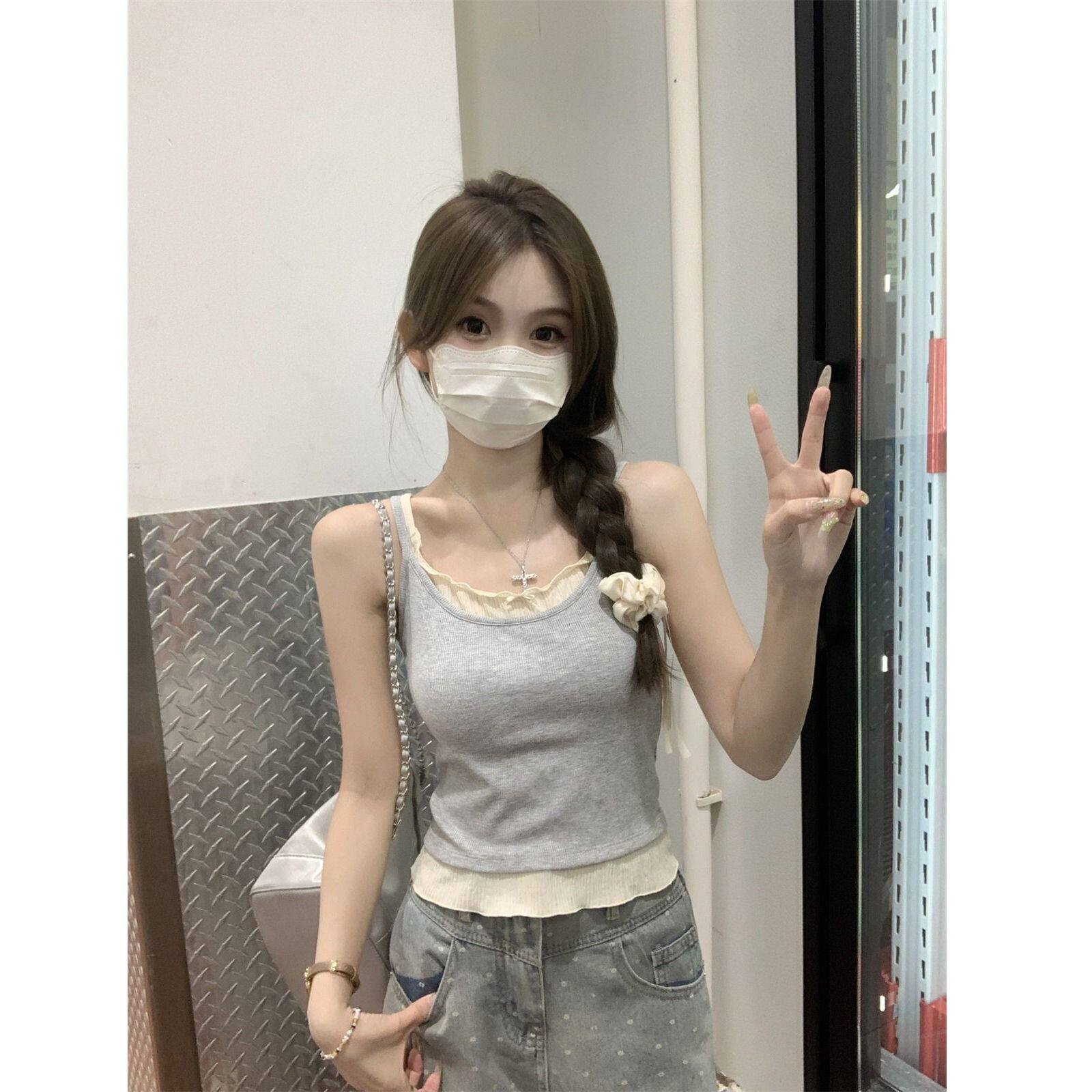 上衣潮 灰色别致小众花边遮副乳无袖 假两件吊带背心女2025新款 修身