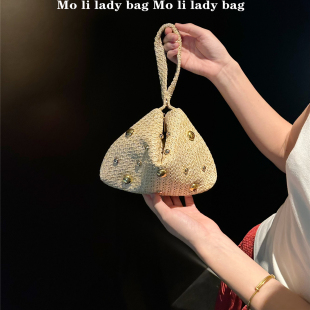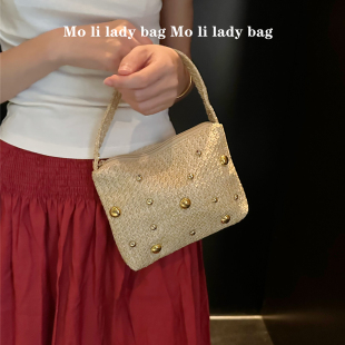 小新款 欧美复古钉珠金珠单肩小方包手提包手腕包 众设计草编包法式