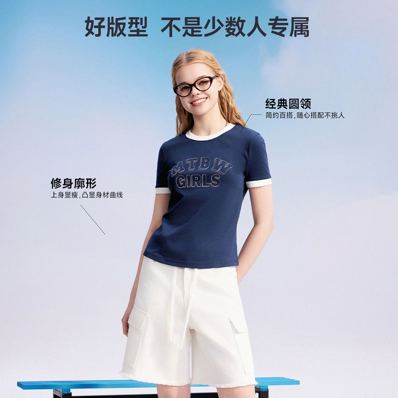 修身 美特斯邦威短袖 美式 新款 潮流撞色学院印花圆领体恤 恤女士夏季