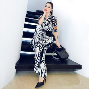 时尚 气质炸街连身阔腿裤 欧美印花中袖 新款 收腰连体裤 VJE夏季