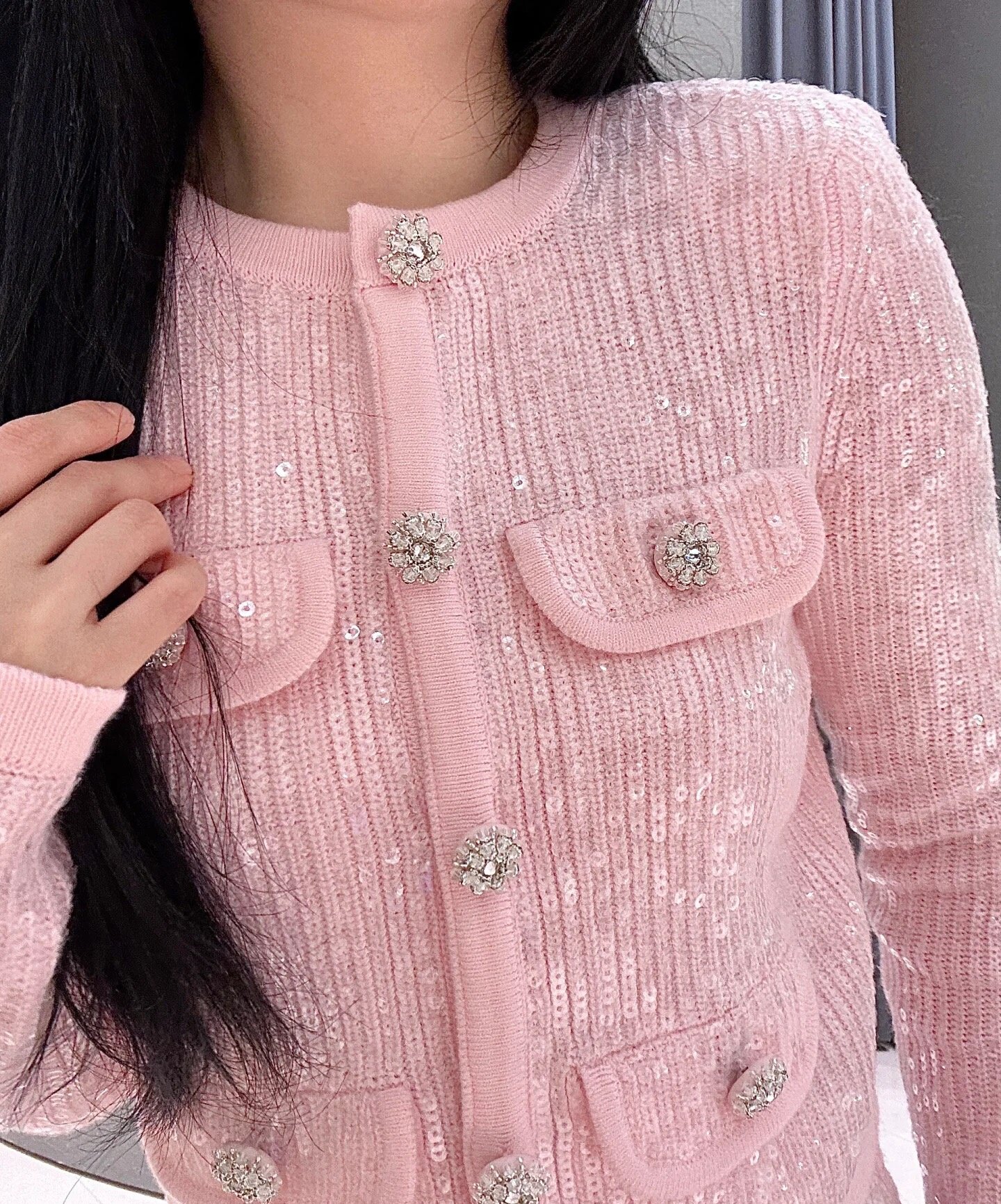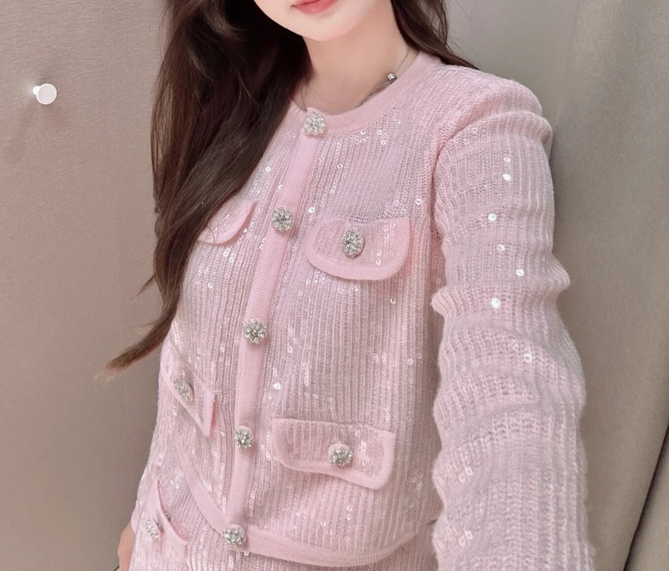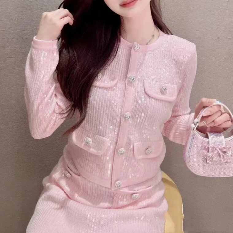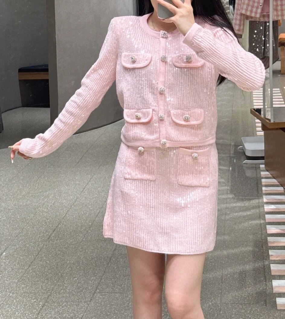 stride 高腰女装 2025新款 气质修身 粉色亮片小香风针织套装 self