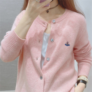 羊绒 100%纯羊毛宽松刺绣外套打底长袖 圆领针织开衫 女2024秋冬新款