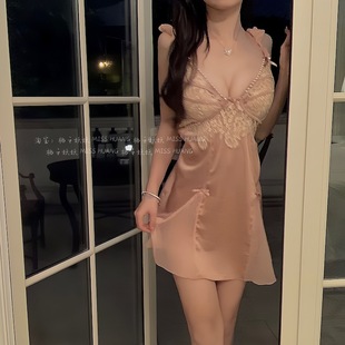 Roseberrrry白桃心事 纯欲蕾丝甜美吊带睡裙冰丝性感睡衣带胸垫