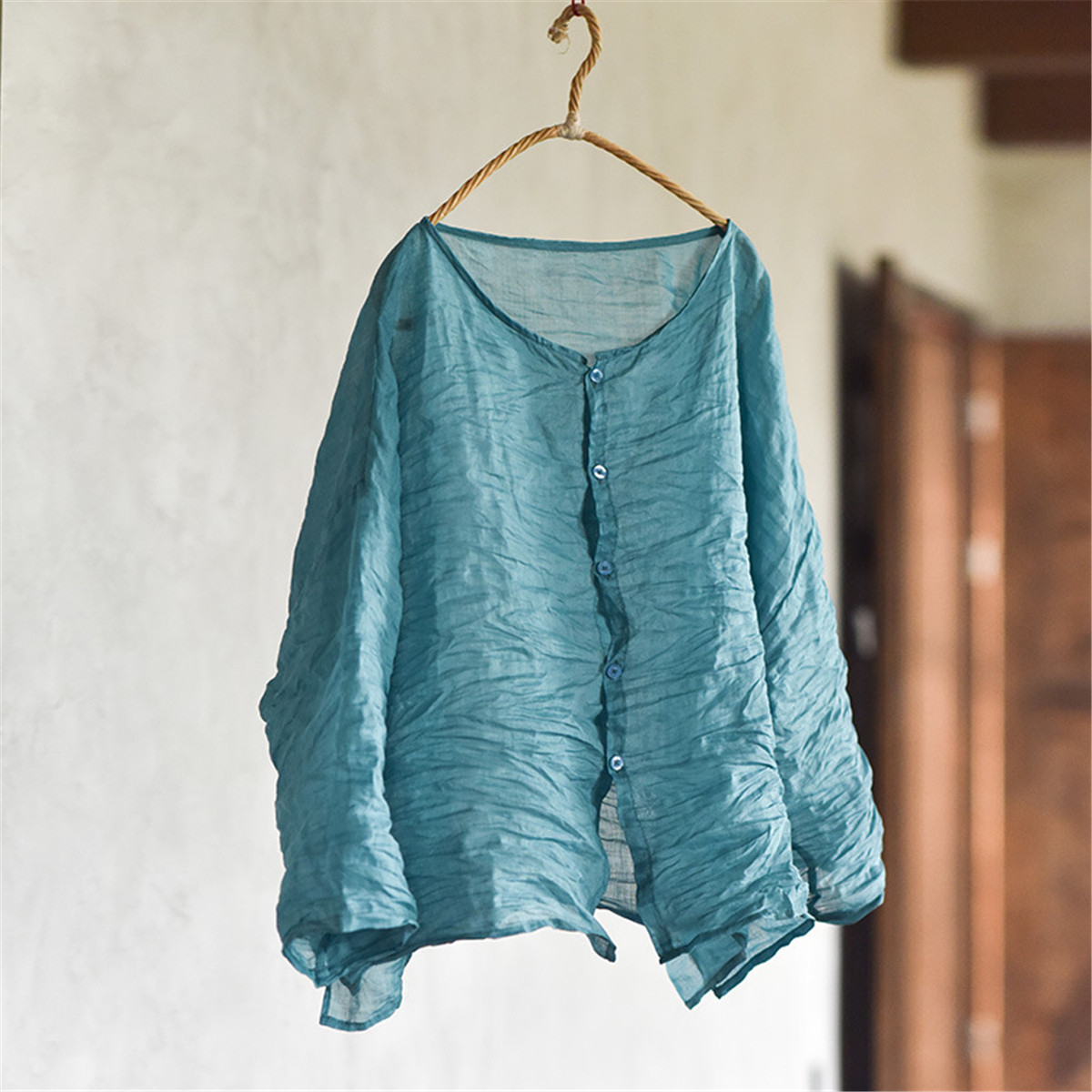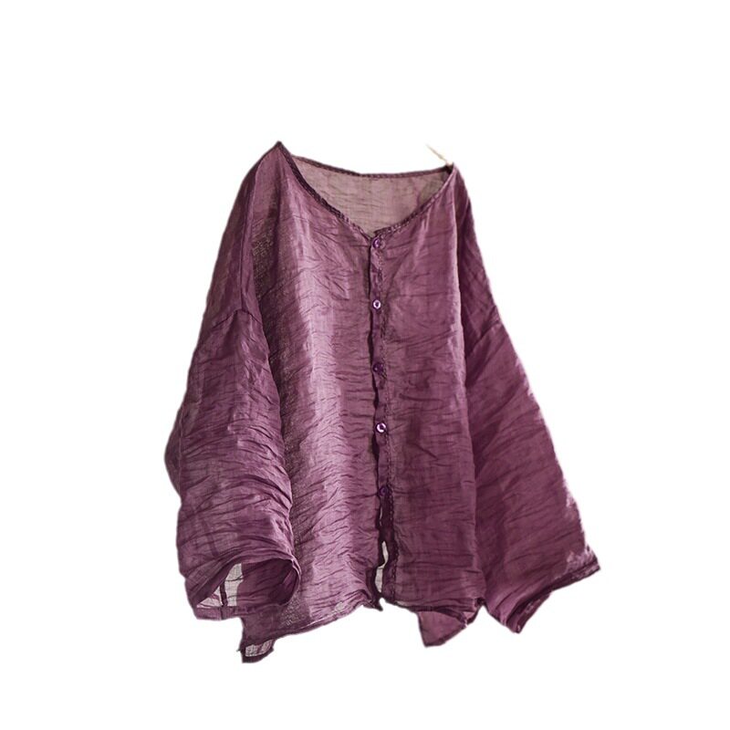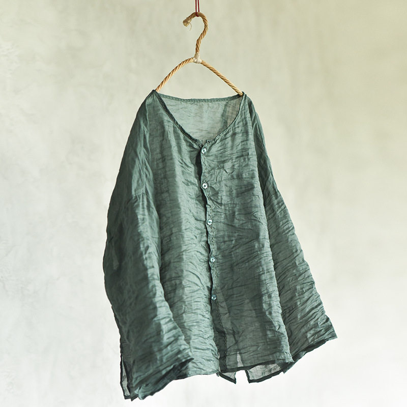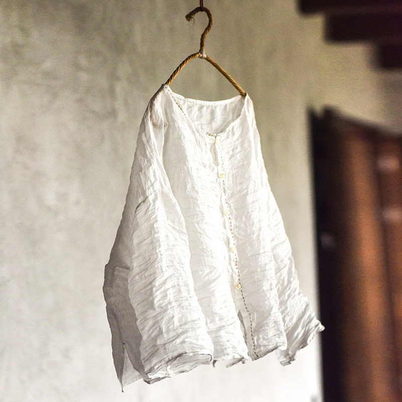 上衣防晒麻衫 子曰原创自制文艺复古轻薄苎麻衬衫 手工缝线圆领开衫