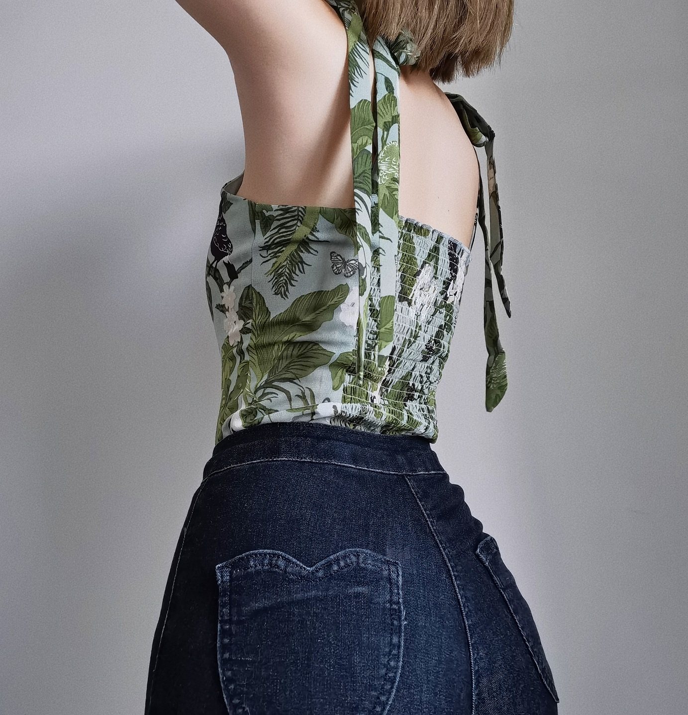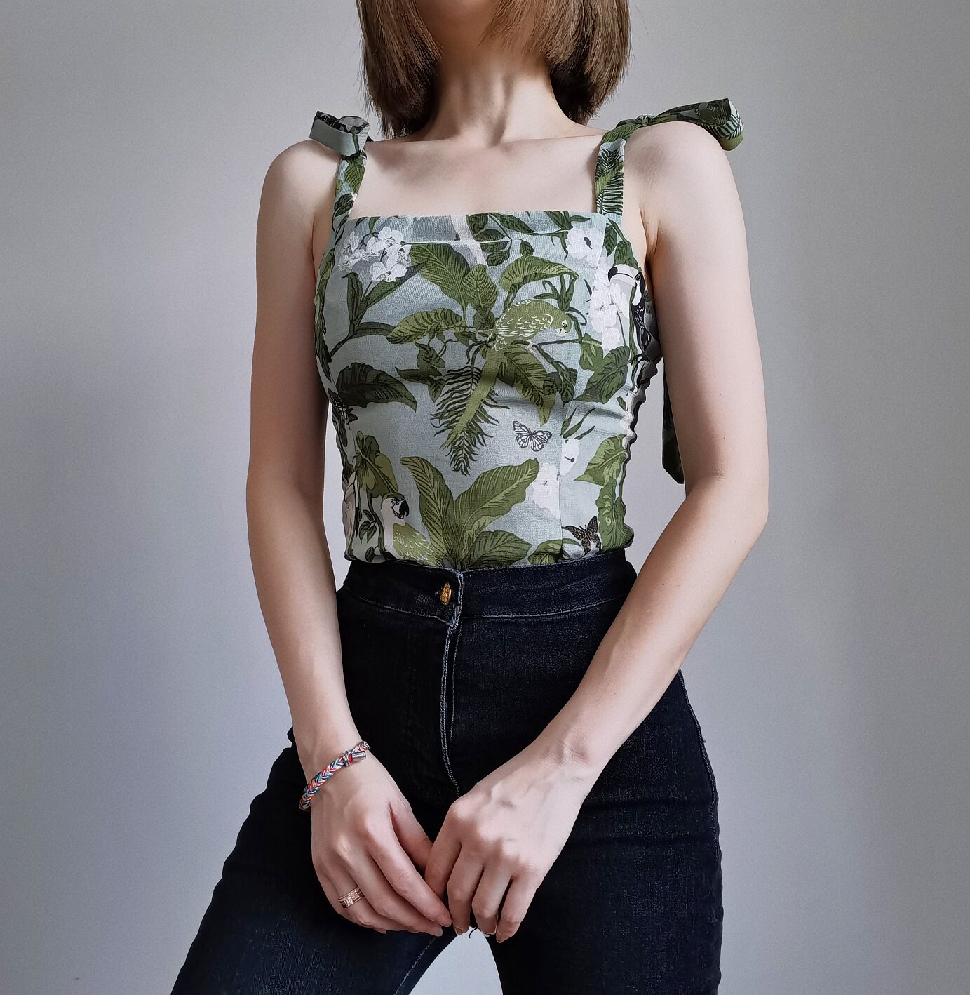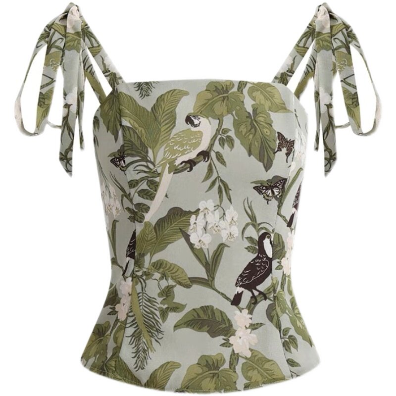 法式 复古花鸟绿印花系带打底性感侧开叉收腰显瘦吊带茶歇背心上衣