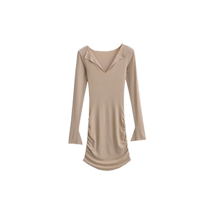 YoungGirlDay纯欲风性感V领紧身显瘦褶皱长袖 打底连衣裙包臀短裙