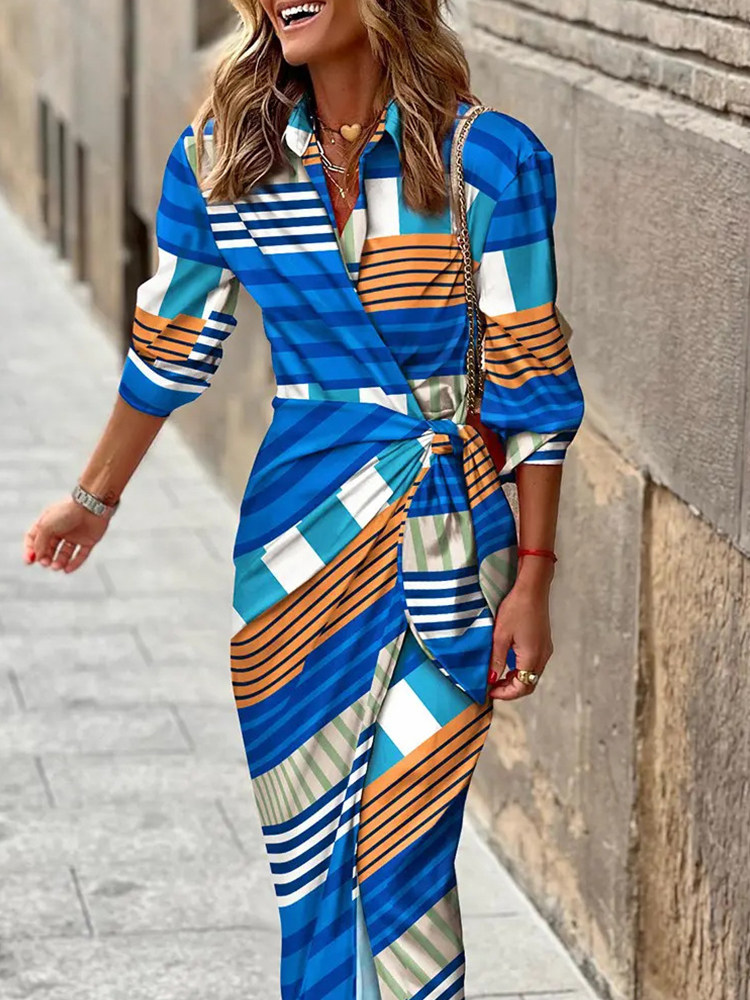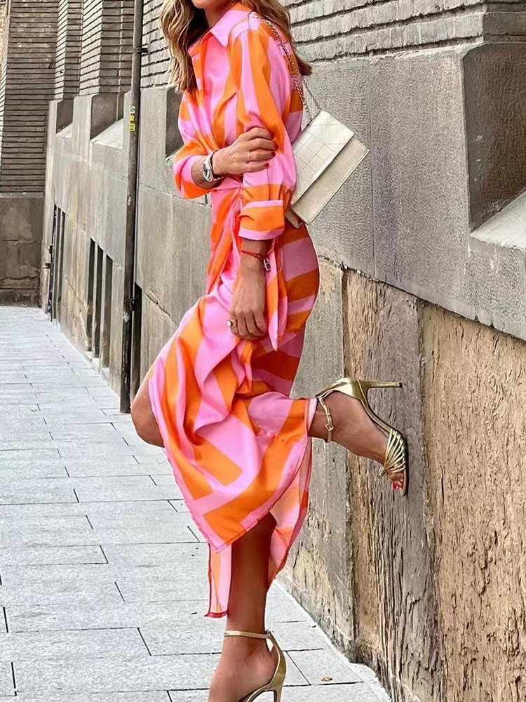 Maxi Dresses Shirt Long Dress Women Slim Lapel Belt Commute