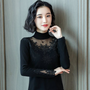 黑色上衣女洋气小衫 春秋黑色长袖 潮 2026新款 半高领蕾丝网纱打底衫