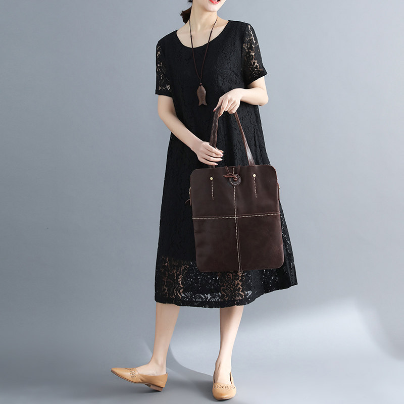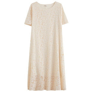 裙子 好质量夏新款 蕾丝连衣裙镂空圆领文艺纯色短袖 女装 棉质 大码