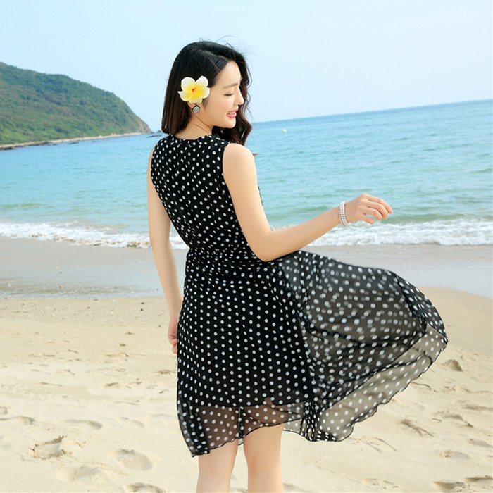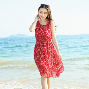 波西米亚背心裙红色波点无袖 飘逸海边度假沙滩裙 雪纺连衣裙夏短款