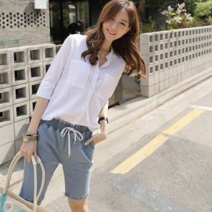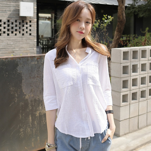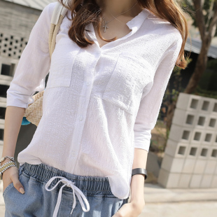 女韩范宽松显瘦休闲气质新款 夏季 棉麻衬衫 百搭七分袖 上衣衬衣 薄款