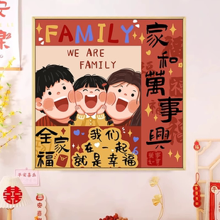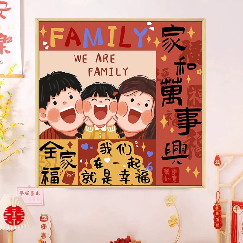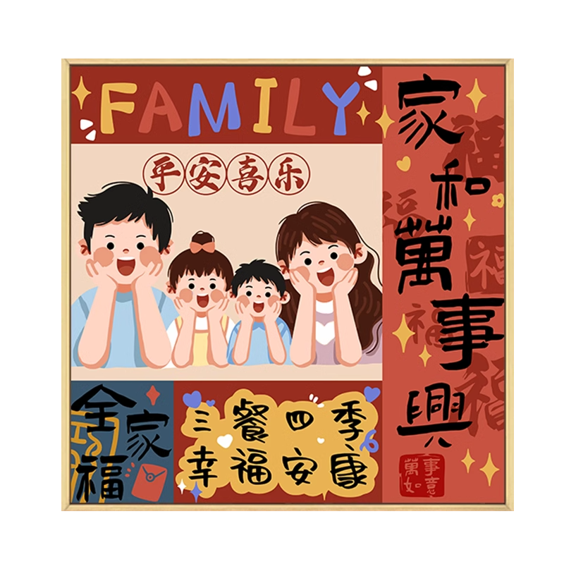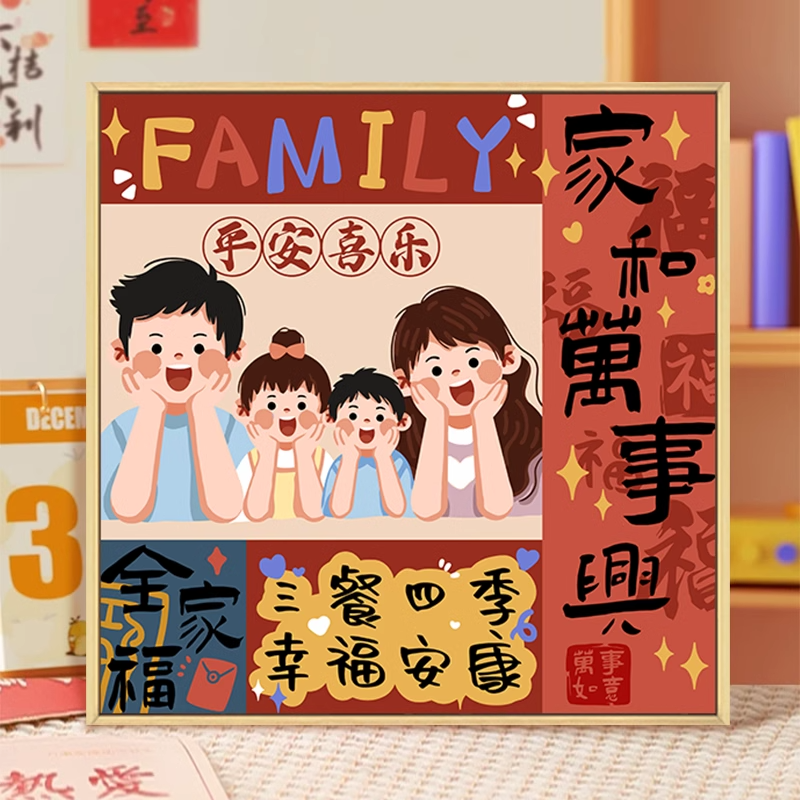 新年全家福数字油画diy填色手绘温馨一家三四口卡通油彩装 饰画