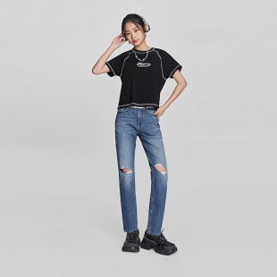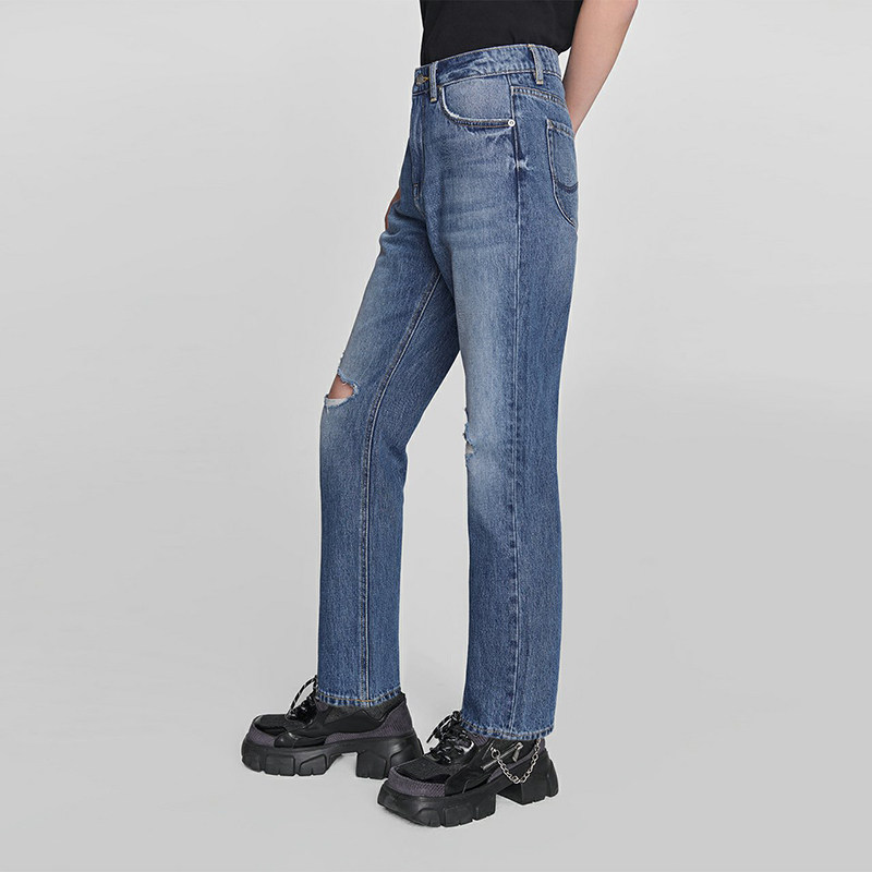 中腰直脚破洞设计中浅蓝女士牛仔裤 Lee422修身 潮流 张凌赫代言