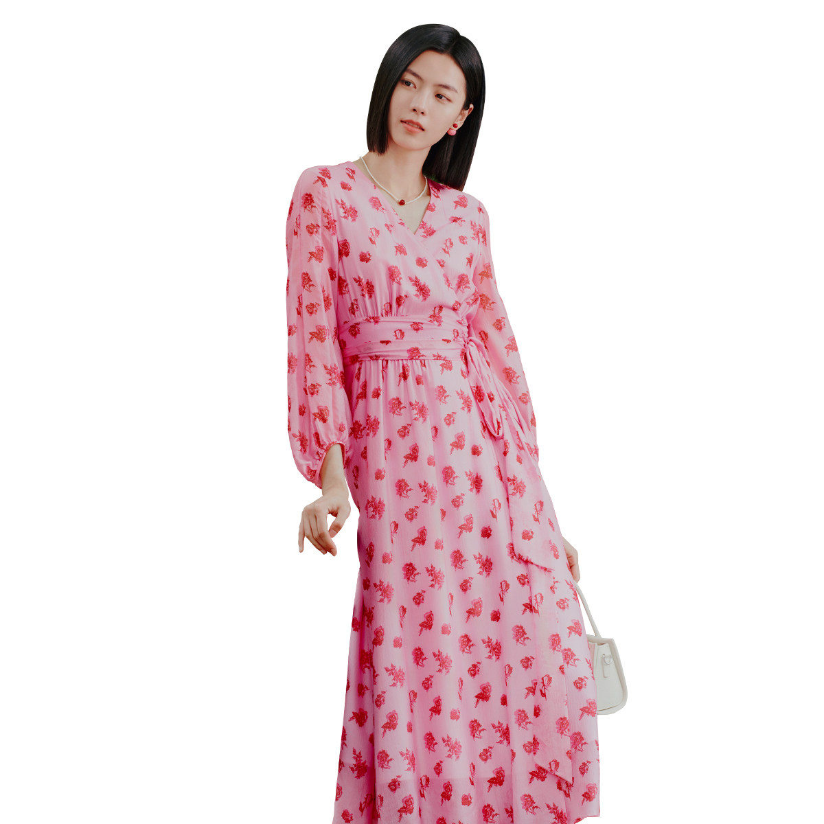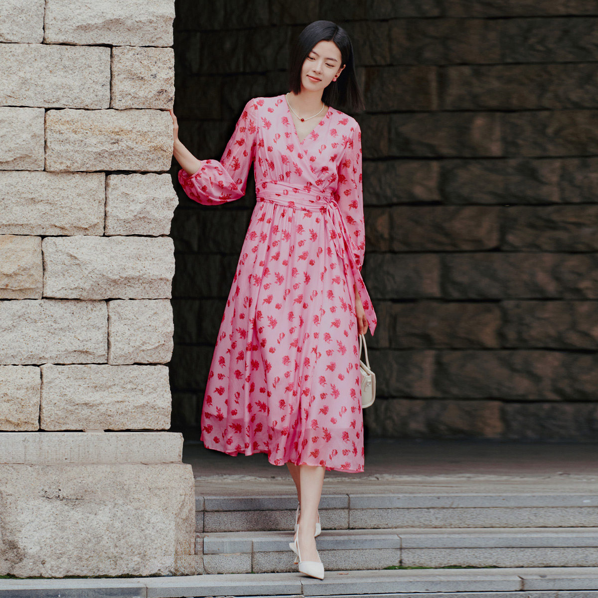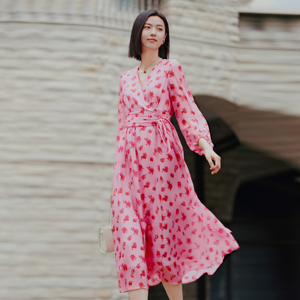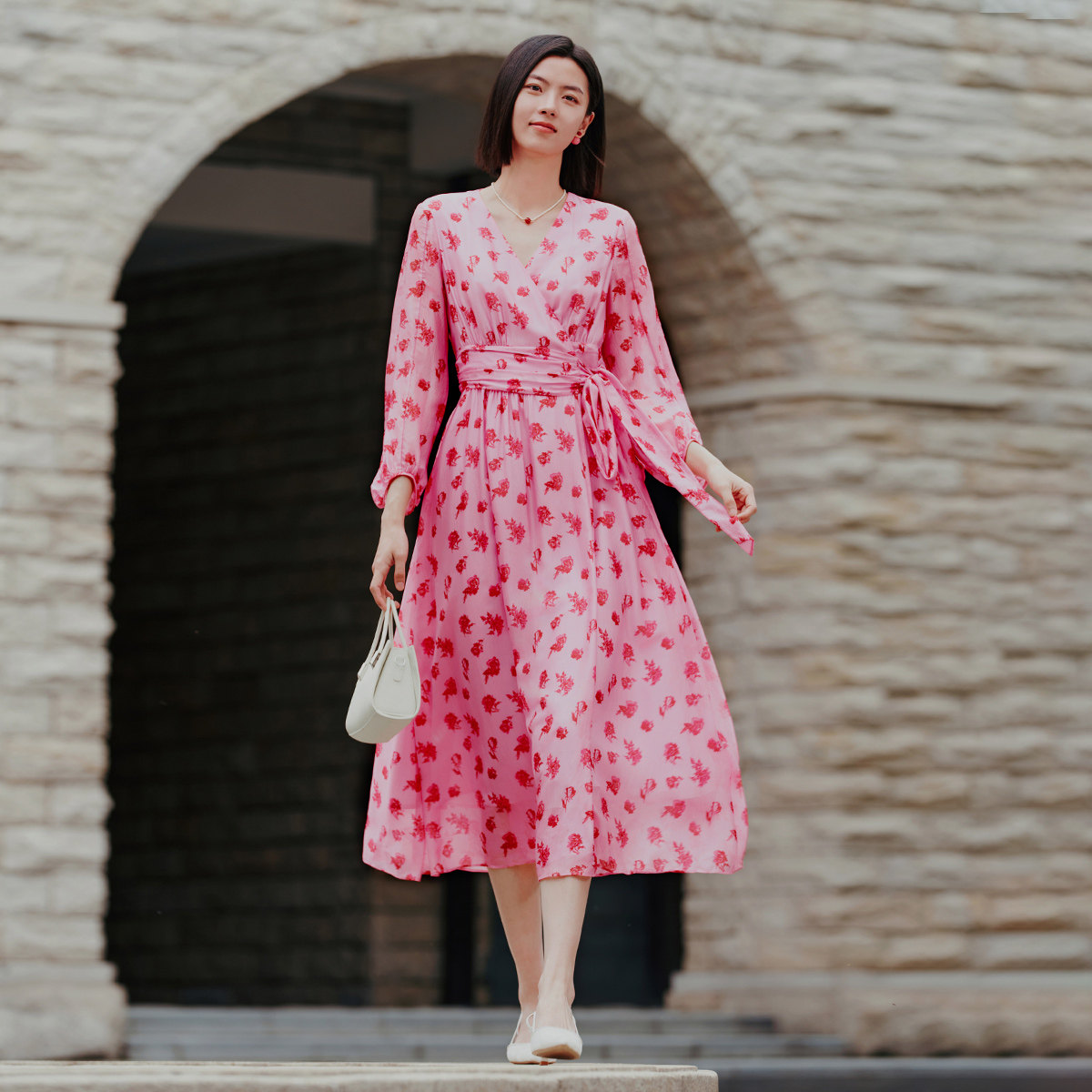 气质碎花收腰连衣裙 专柜新款 歌蒂诗春季 8E31L3385 100%桑蚕丝