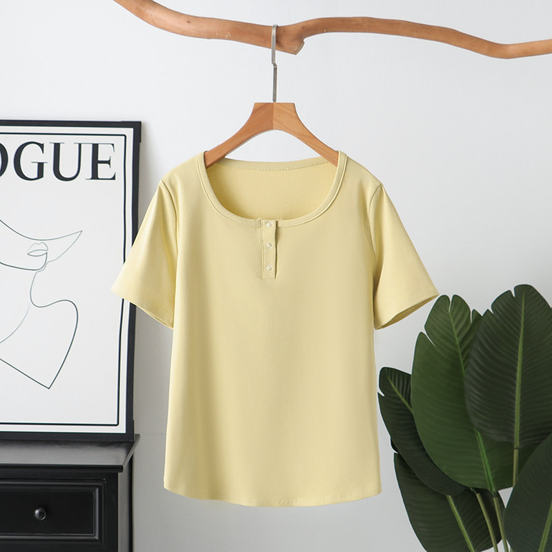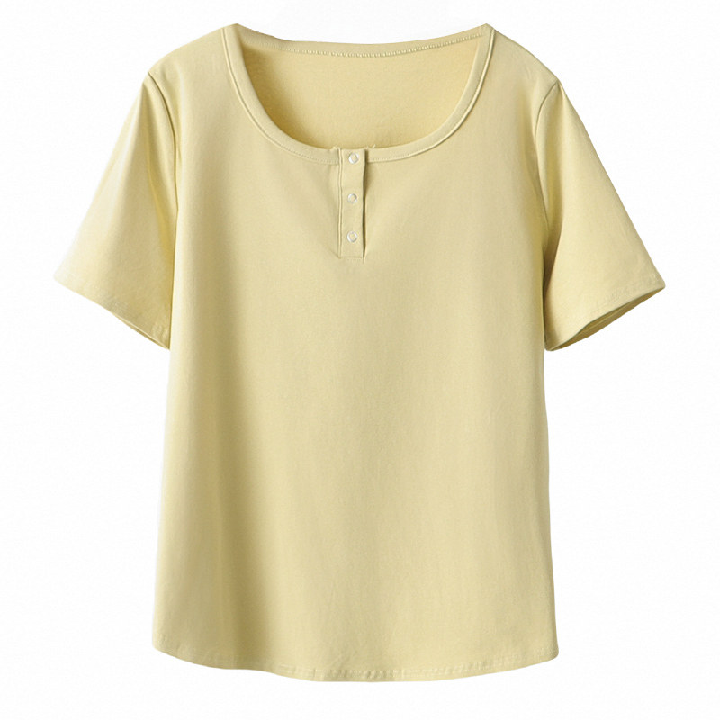 女装 设计感方领钉扣短袖 T恤200斤胖mm宽松遮肚子显瘦正肩上衣大码